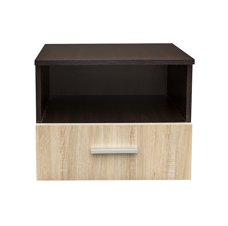 Noptiera Alma are 3 spatii de depozitare: suprafata de sus, un raft deschis si un sertar. Este realizata din PAL melaminat, cant ABS, are manere satinate si picioare PVC.