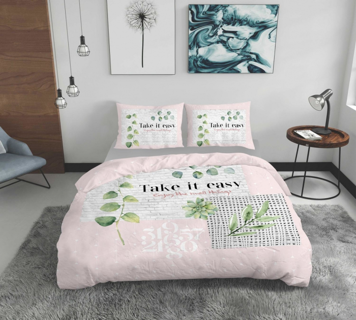 Setul de lenjerie de pat dubla Take it Easy contine 4 piese: 1 cearceaf de pat (200x220 cm), 1 cearceaf pentru pilota (180x200 cm) si 2 fete de perna (50x70 cm). Este confectionat 100% din bumbac, oferind o temperatura optima pe parcursul intregii nopti.