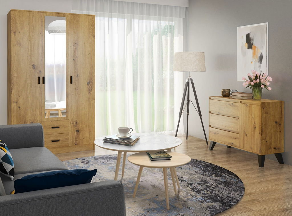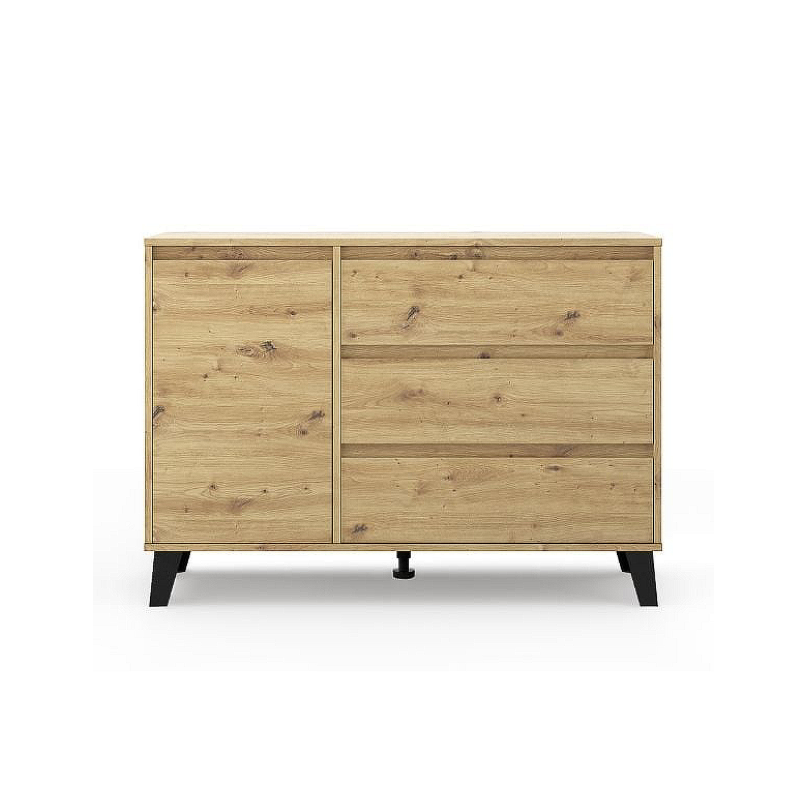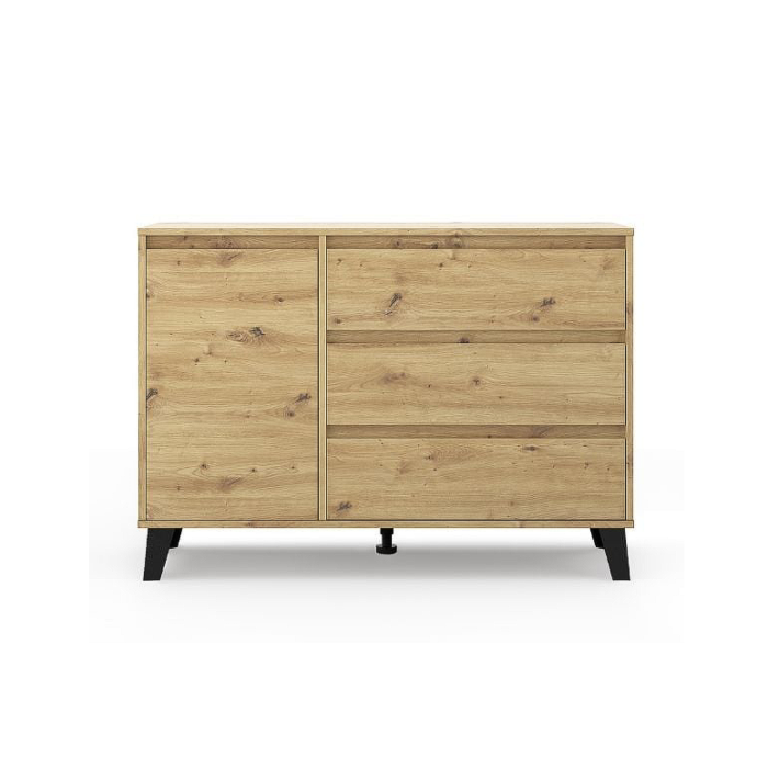 Comoda BORG în decor stejar artisan cu ușa și 3 sertare este o soluție ideală pentru cei care caută o piesă de mobilier practică și stilată pentru depozitare. Datorită construcției sale, oferă un spațiu generos pentru organizarea hainelor, lenjeriei, accesoriilor sau documentelor.