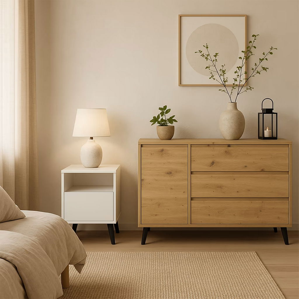 Designul minimalist și disponibilitatea în culori clasice, precum alb, cașmir sau stejar artisan, fac ca comoda BORG să se integreze cu ușurință în diferite stiluri de amenajare interioară, de la cele moderne până la cele tradiționale. Forma sa simplă și finisajul elegant o transformă într-un adaos versatil pentru dormitor, living sau hol.
