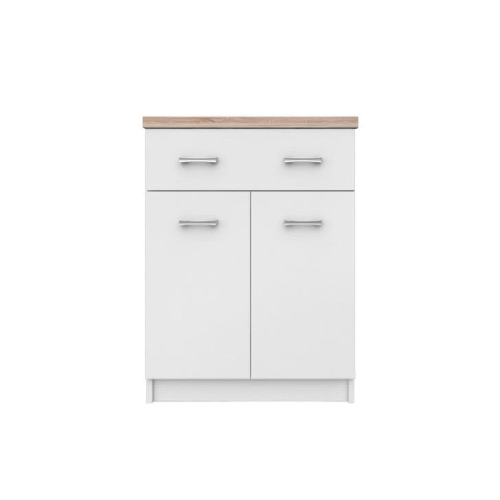 Comoda TOP MIX cu 2 usi si 2 sertare este o piesă de mobilier versatilă, ideală pentru spații precum: living, hol, dormitor, dressing, cameră de tineret sau pentru copii, dar și pentru birou ori cabinet. Modulul este prevăzut cu un sertar lung, perfect pentru organizarea obiectelor mici, iar cele două uși oferă spațiu practic pentru depozitarea veselei, lenjeriei de pat sau hainelor. Comoda este disponibilă în două combinații de culori: stejar sonoma și alb cu blat ce imită lemnul – alegere care facilitează integrarea în orice tip de interior. Sfat: Montarea unei polițe deasupra comodei completează armonios amenajarea și oferă spațiu suplimentar de depozitare.