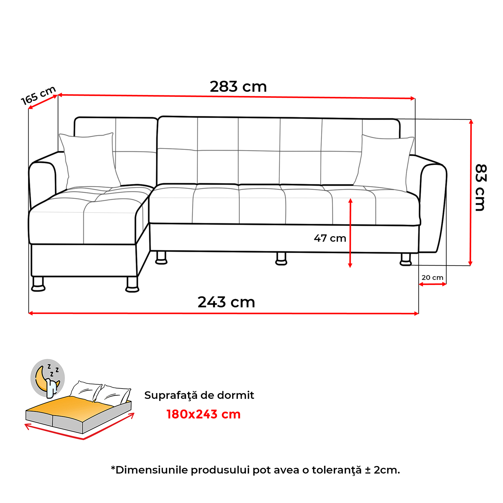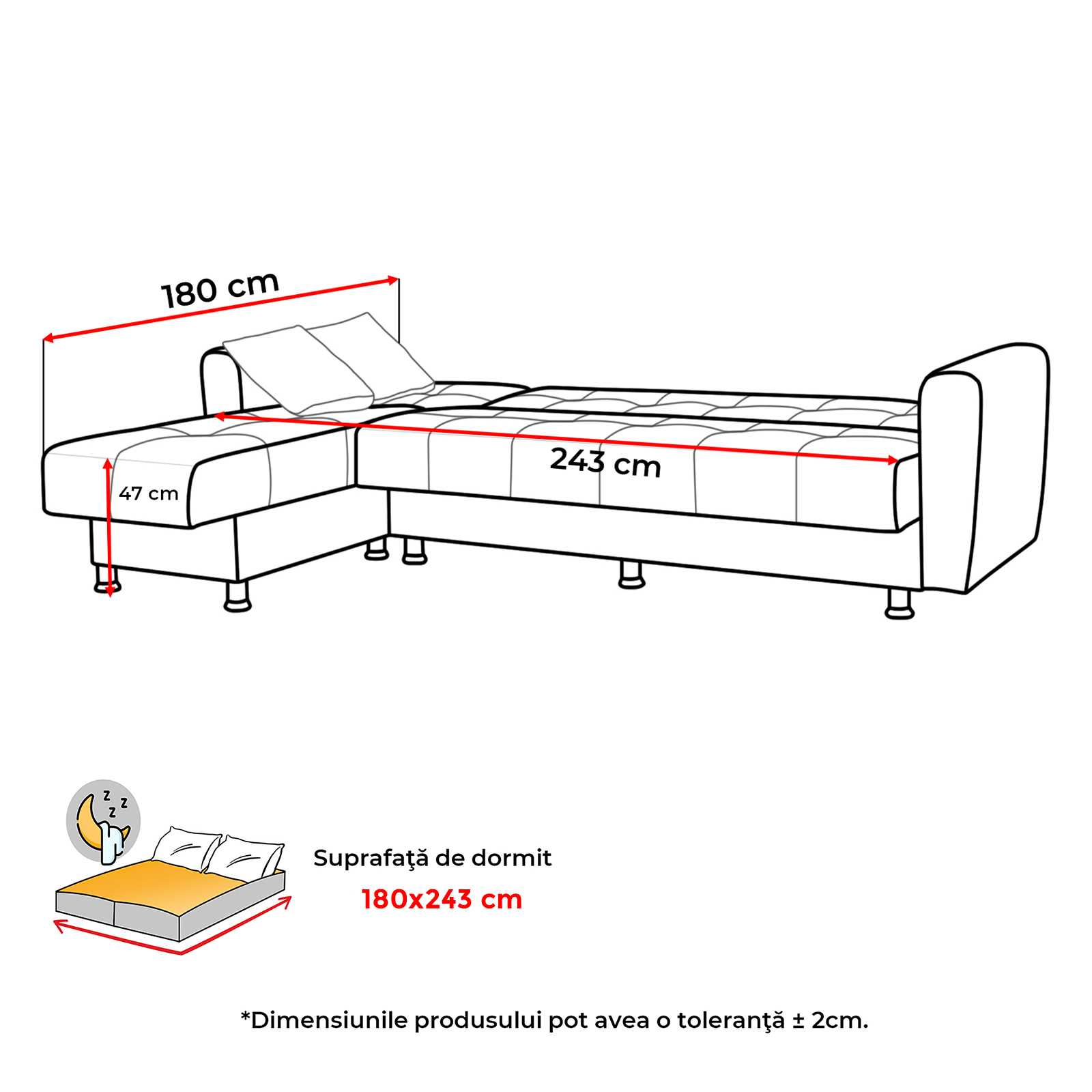 Descriere: Coltarul ANGELA va completa perfect livingul dumneavoastra. Versatil si foarte confortabil, coltarul se poate integra cu usurinta pentru amenajarea spatiului interior. Designul clasic da o nota de distinctie in interiorul casei. Suprafata de dormit a coltarului este confectionata din burete cu densitate ridicata.