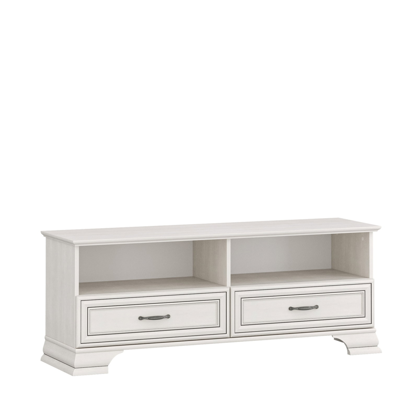 Comoda TV din colecția TIFFANY II este concepută pentru a susține un televizor mare, datorită blatului său solid și rezistent. În plus, mobilierul este prevăzut cu rafturi deschise și două sertare, care sunt ideale pentru depozitarea unor obiecte precum telecomenzi, CD-uri sau reviste. Caracterul piesei este evidențiat de mânerele metalice și sertarele decorate.