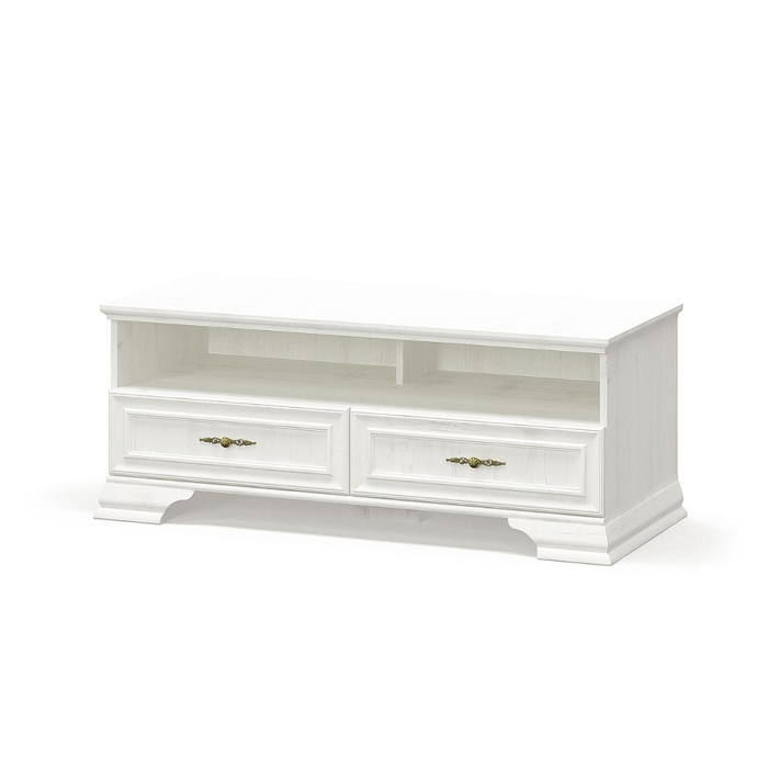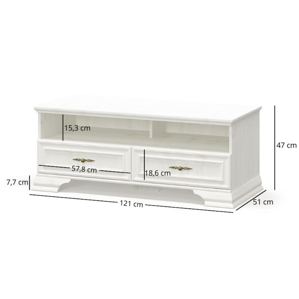 Fronturile cu ramă, picioarele decorative din MDF și mânerele metalice subtile adaugă comodei rafinament și o fac să atragă privirile. Două sertare spațioase, echipate cu ghidaje cu bile și extensie totală, oferă un spațiu convenabil pentru depozitarea telecomenzilor, DVD-urilor și altor accesorii. Astfel, vei menține ordinea în zona ta multimedia.
