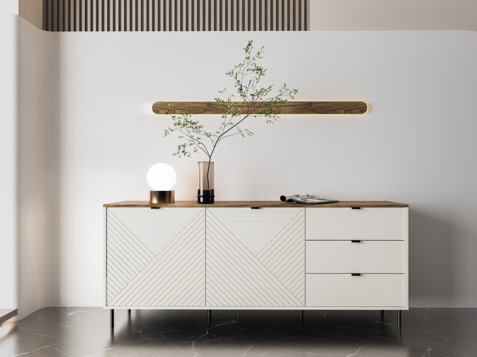 Comoda EVO cu rafturi și trei sertare pe picioare este un mobilier modern care îmbină funcționalitatea cu un design deosebit. Fronturile comodei sunt decorate cu un model geometric în relief, oferindu-i un aspect elegant și contemporan. Realizată într-o nuanță la modă de kaszmir, comoda se remarcă printr-un stil subtil, dar expresiv, care se potrivește perfect cu diverse amenajări interioare. Blatul în nuanța stejarului Castello completează ansamblul, adăugând un accent cald și natural. Comoda oferă un spațiu generos cu rafturi și trei sertare practice, care asigură un loc comod pentru depozitarea hainelor, accesoriilor sau a altor obiecte mici. Picioarele elegante adaugă lejeritate comodei, creând un aspect modern și atemporal. Ideală pentru living, dormitor sau hol, comoda cu rafturi și sertare combină estetica cu funcționalitatea, aducând ordine și stil în orice încăpere.