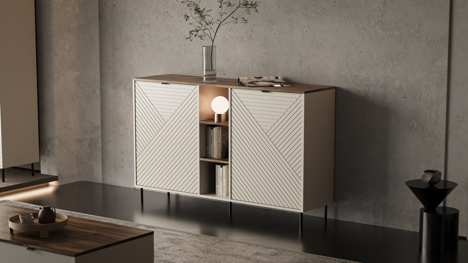 Comoda EVO cu rafturi închise și deschise, prevăzută cu picioare adaptate pentru robotul de curățenie, este un mobilier elegant care îmbină designul modern cu funcționalitatea. Realizată într-o nuanță la modă de kaszmir, comoda se remarcă printr-un stil subtil, dar expresiv, potrivit pentru diverse amenajări interioare. Fronturile comodei sunt decorate cu un model geometric în relief, conferindu-i un caracter unic. Blatul în culoarea stejarului Castello completează armonios ansamblul, adăugând un accent natural și cald. Comoda oferă o organizare spațioasă, cu rafturi atât închise, cât și deschise, asigurând funcționalitate ridicată și posibilitatea de a depozita diferite obiecte într-un mod estetic. Picioarele îi conferă lejeritate și un aspect modern, făcând-o alegerea ideală pentru living, dormitor sau hol. Un mobilier ce combină practicitatea cu eleganța, creând un element stilat în decorul interior.