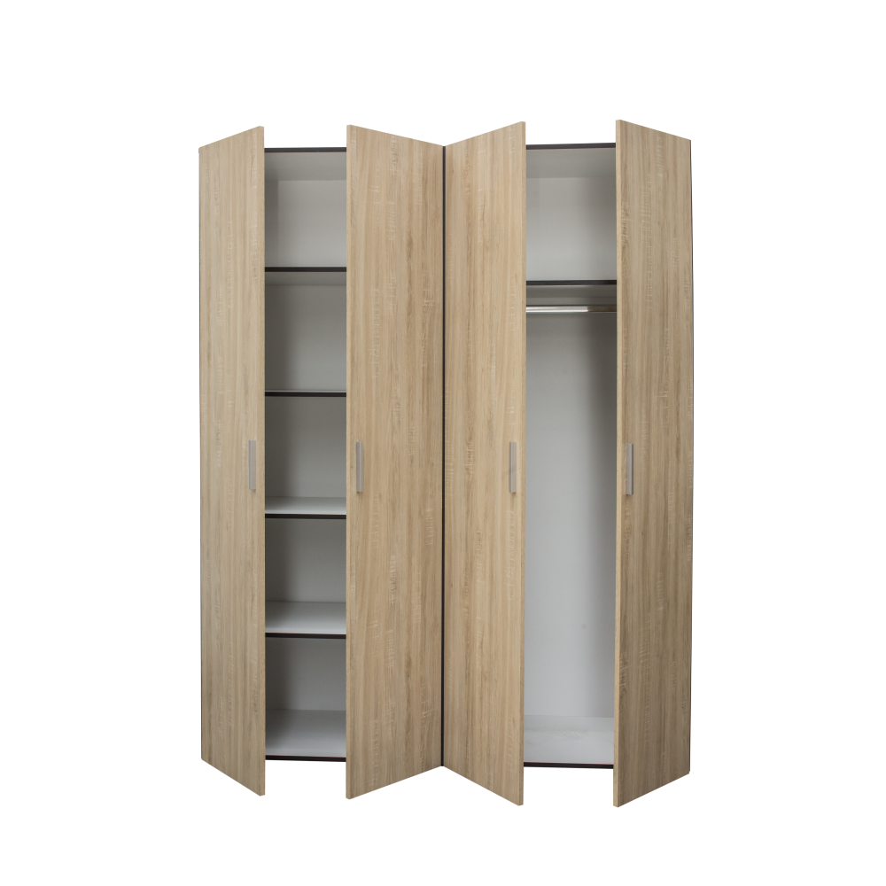 Dulap in 4 usi realizat din PAL melaminat, unde compartimentarea ajuta la eficientizarea spatiului de depozitare. Dulapul contine o polita fixa in partea superioara si bara de umerase si 4 polite in partea stanga.