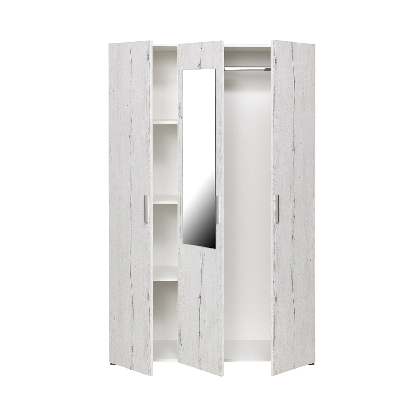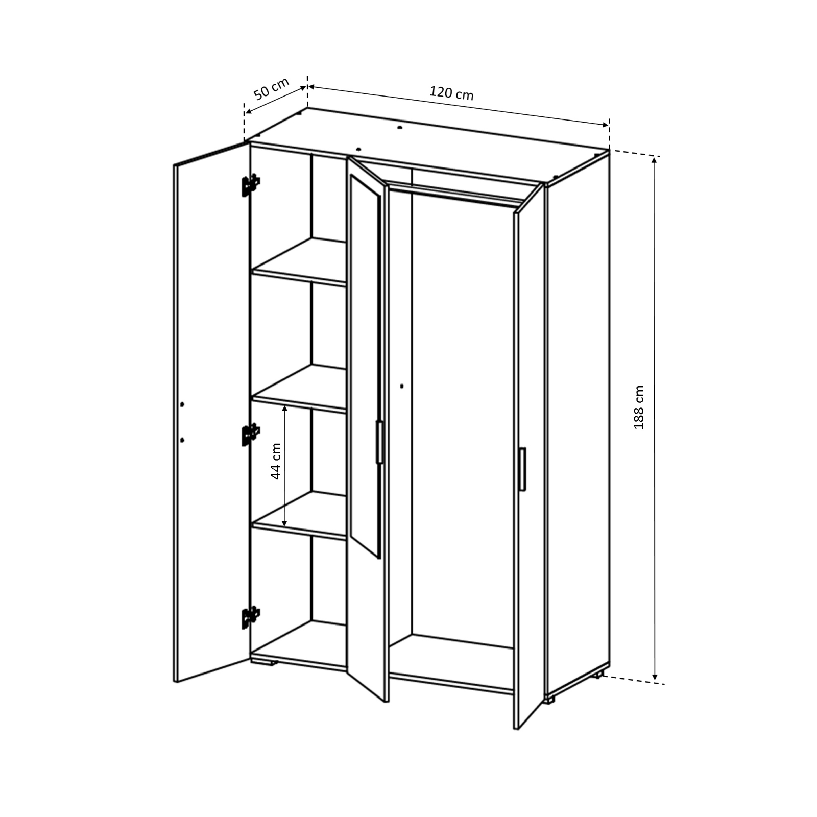 Dulap in 3 usi realizat din PAL melaminat ce contine 3 polite în partea stânga și suport pentru umerase în partea dreapta. Inaltimea dulapului permite sa fie montat chiar si in camerele cu o inaltime de maxim 2m.