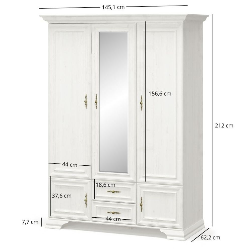 Fronturile cu ramă ale dulapului sunt realizate din MDF și HDF, apoi acoperite cu folie specială pentru mobilier, asigurând durabilitate și rezistență la umiditate și deteriorări mecanice. Oglinda mare din partea centrală a dulapului nu doar mărește vizual spațiul, dar îți permite și să verifici rapid aspectul înainte de a pleca. Picioarele decorative și mânerele metalice aurii adaugă un plus de eleganță.