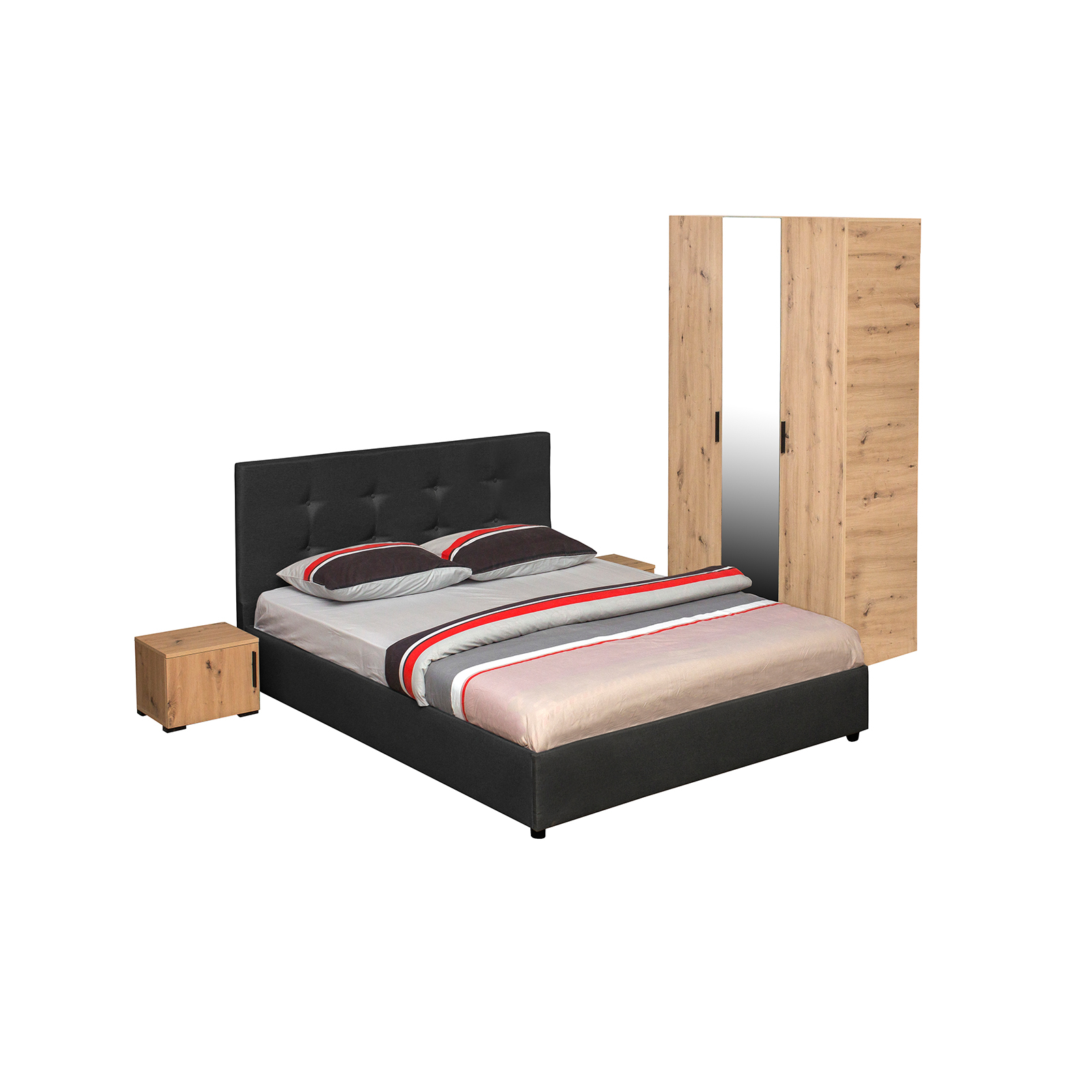 Set dormitor ECONO, 4 piese, pat 140x200 cm, dulap 3 usi, 2 noptiere, artisan + gri antracit