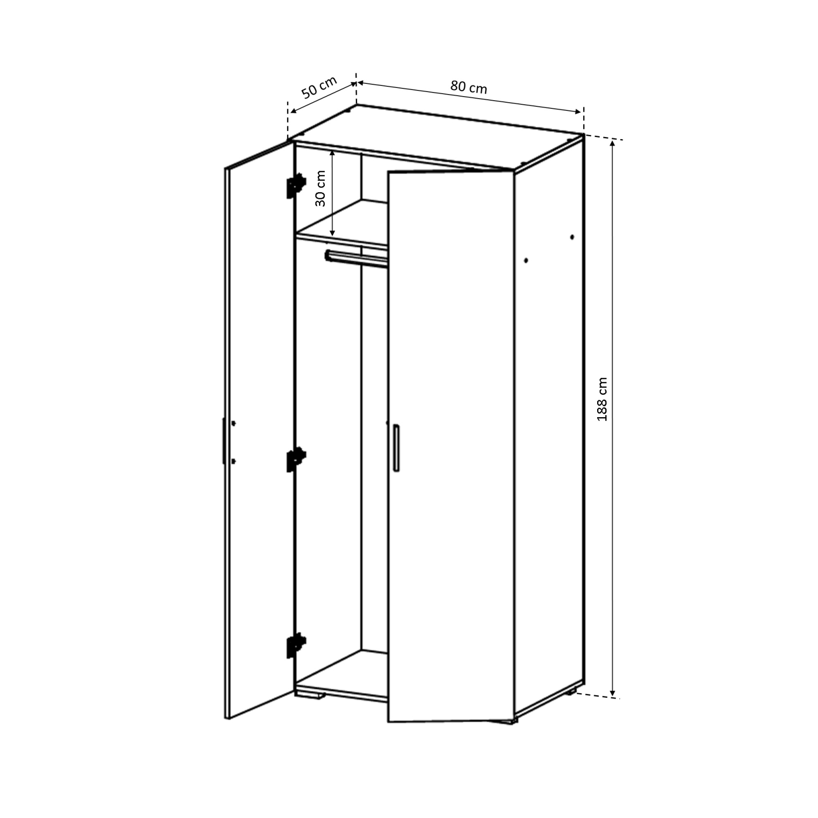 Dulap in 2 usi realizat din PAL melaminat ce contine o bara de haine. Inaltimea dulapului permite sa fie montat chiar si in camerele cu o inaltime de maxim 2m.