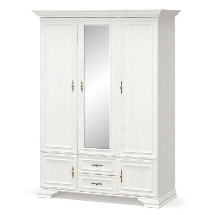 Fronturile cu ramă ale dulapului sunt realizate din MDF și HDF, apoi acoperite cu folie specială pentru mobilier, asigurând durabilitate și rezistență la umiditate și deteriorări mecanice. Oglinda mare din partea centrală a dulapului nu doar mărește vizual spațiul, dar îți permite și să verifici rapid aspectul înainte de a pleca. Picioarele decorative și mânerele metalice aurii adaugă un plus de eleganță.
