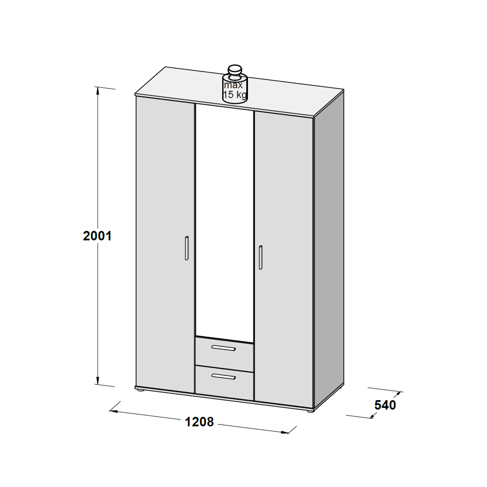Dulap NANO - NNS83S-C510, 3 usi, oglinda, 6 rafturi, bara de haine, stejar tabak + alb, realizat din PAL, manere din plastic cu aspect de aluminiu.