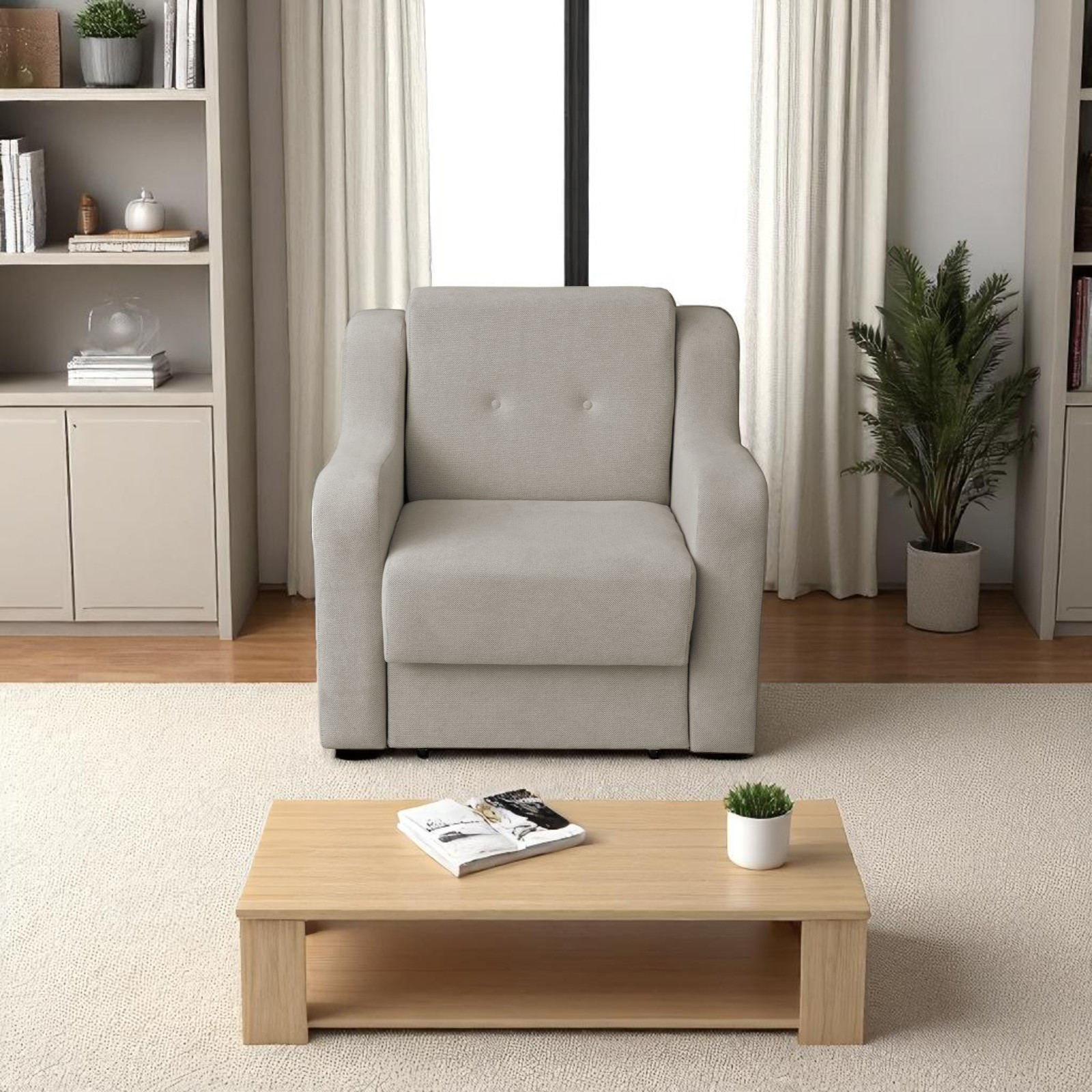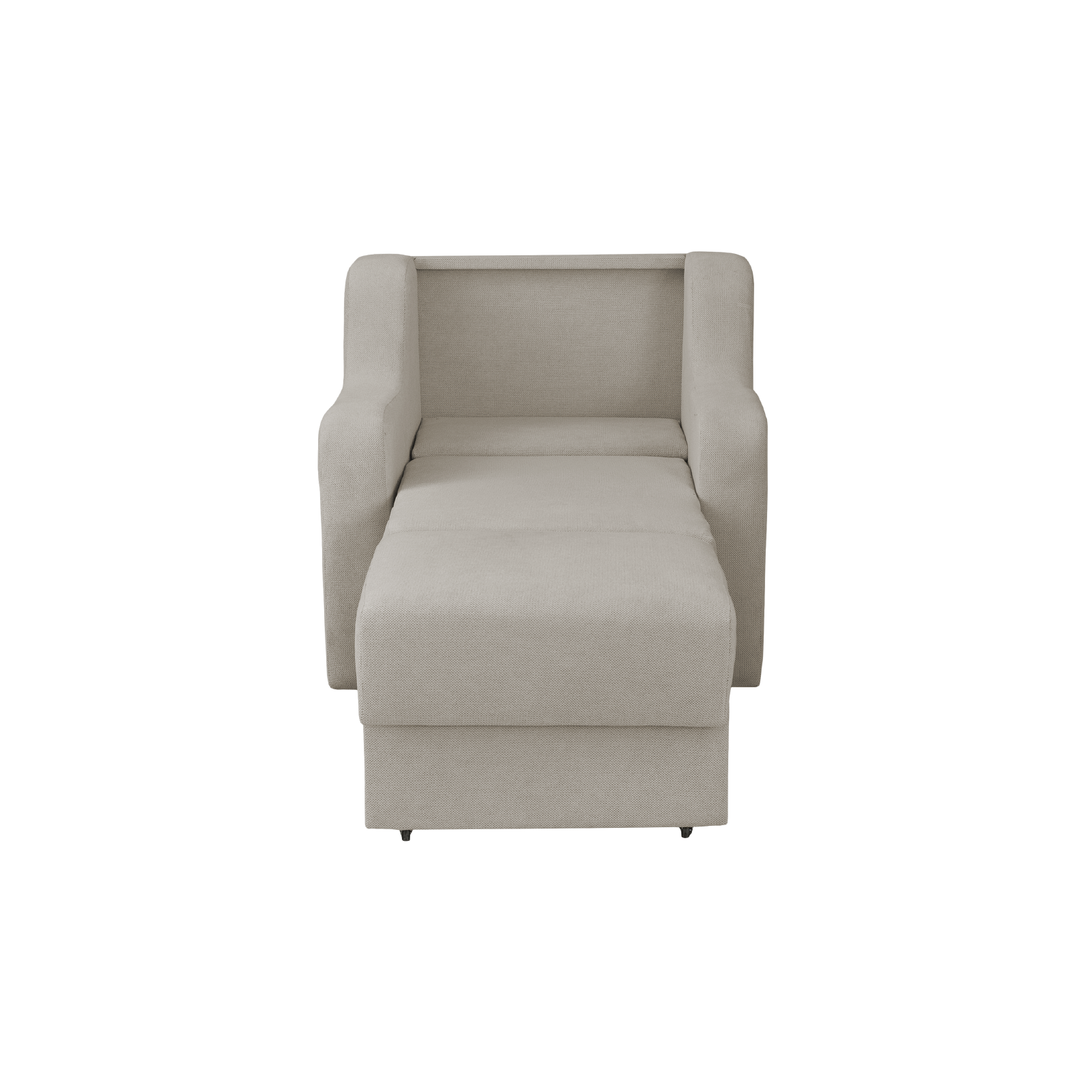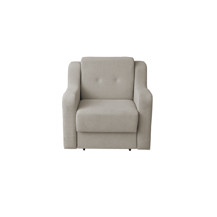 Descriere: Usor de manevrat, fotoliul are un sistem de extensie ingenios care permite sezutului sa se deschida catre in fata cu o miscare lina si cursiva, fara efort, strangerea fotoliului catre modul de zi facandu-se cu aceeasi usurinta. Suprafața de dormit a fotoliului este confectionata din plasa de arcuri tip Bonell, Pasla, vatelina și spuma poliuretanica cu densitate ridicata.Fotoliul este realizat pe structura de lemn, ceea ce constituie o garantie pentru o durata lunga de utilizare si o rezistenta sporita.