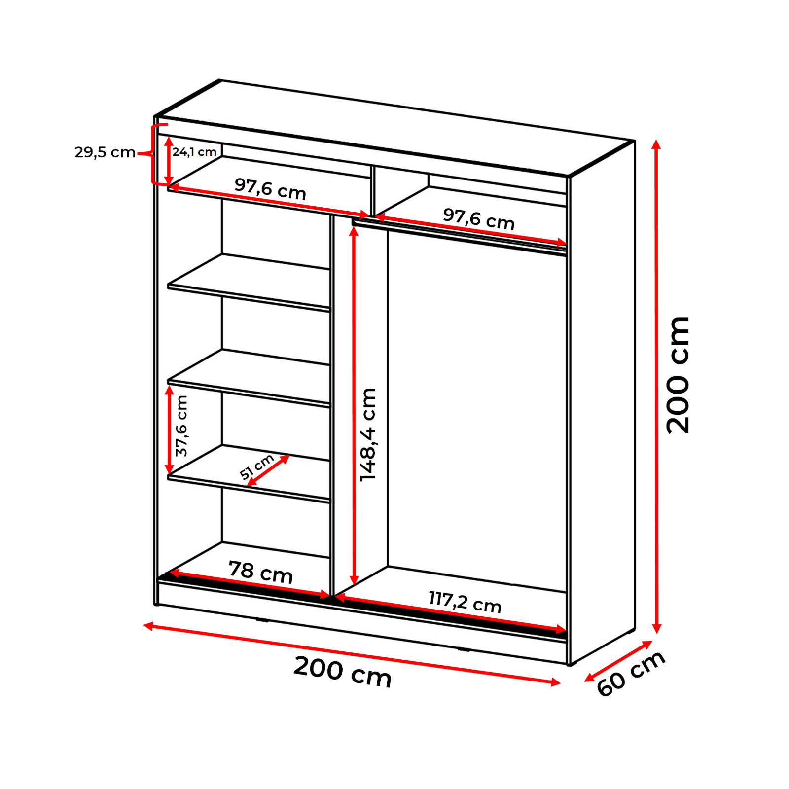 Dulap in 2 usi glisante realizat din PAL melaminat ce contine polite si suport pentru umerase. Inaltimea dulapului permite sa fie montat chiar si in camerele cu o inaltime de maxim 2M.