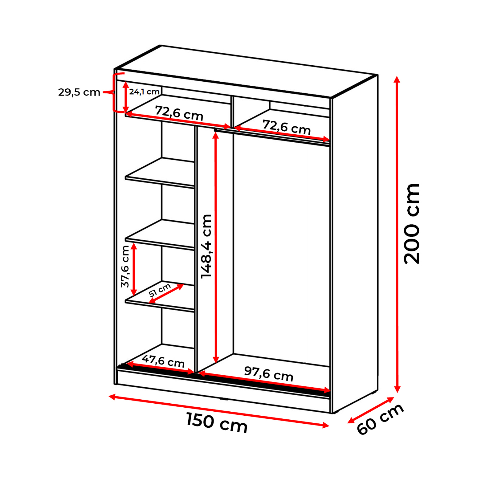 Dulap in 2 usi glisante realizat din PAL melaminat ce contine polite si suport pentru umerase. Inaltimea dulapului permite sa fie montat chiar si in camerele cu o inaltime de maxim 2M.