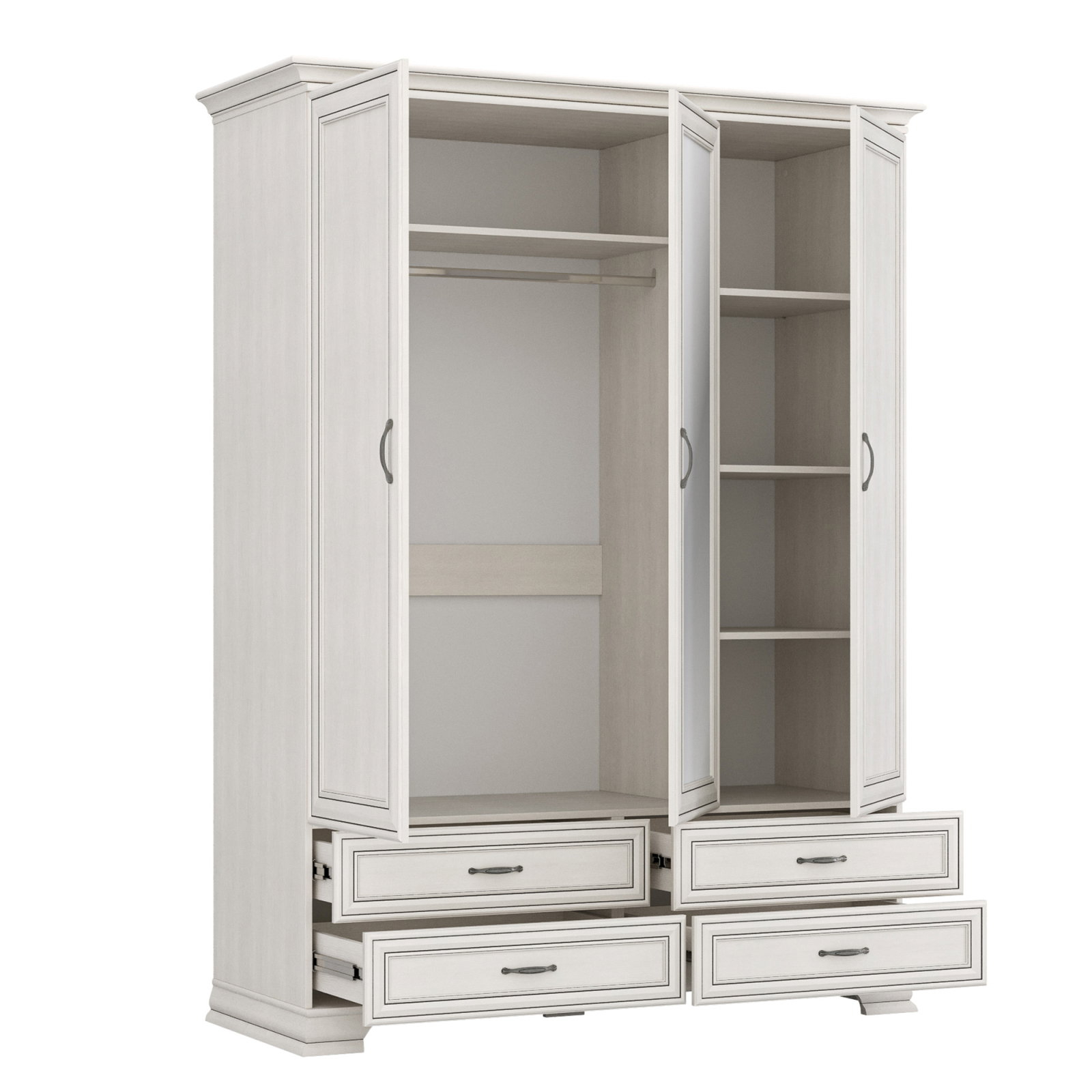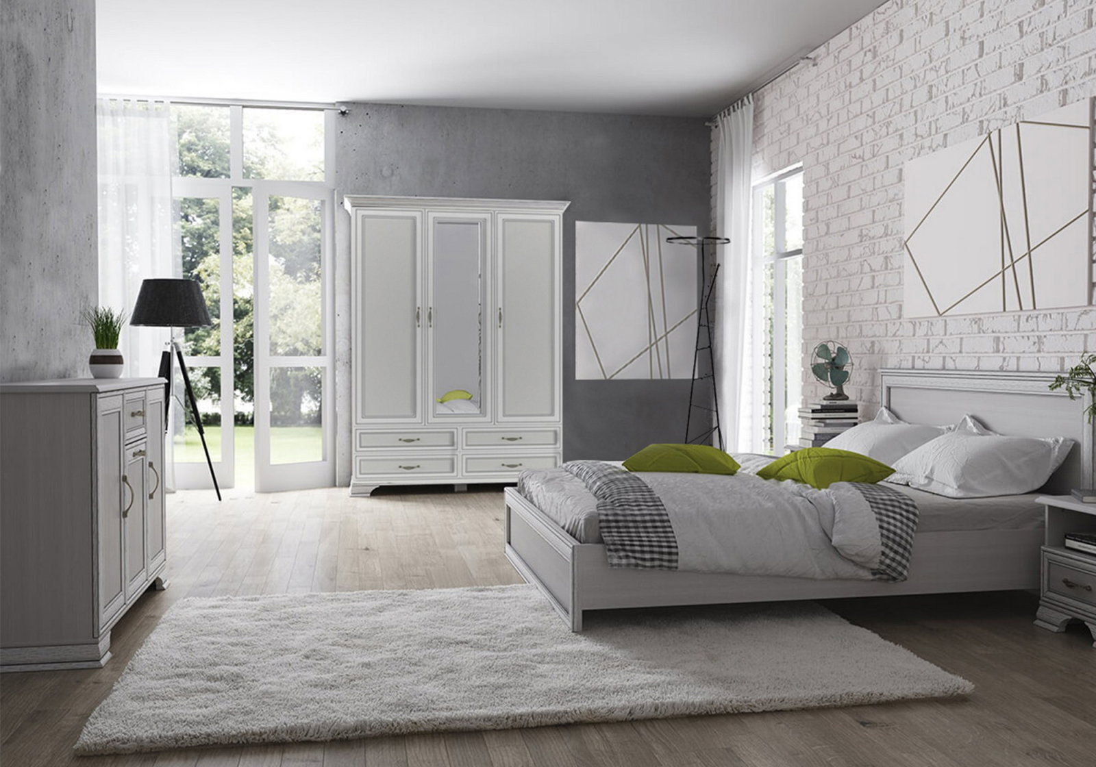 Dulapul cu trei uși TIFFANY II este locul ideal pentru depozitarea lucrurilor. Este prevăzut cu rafturi încăpătoare, o bară pentru umerașe și patru sertare spațioase. Oglinda montată pe ușa din mijloc crește funcționalitatea mobilierului. Caracterul piesei este evidențiat de mânerele metalice și fronturile decorative. Combinând forma clasică cu un design elegant, rezultă un mobilier potrivit pentru orice dormitor sau dressing. Glisierele sertarelor cu extensie completă sporesc confortul utilizării.