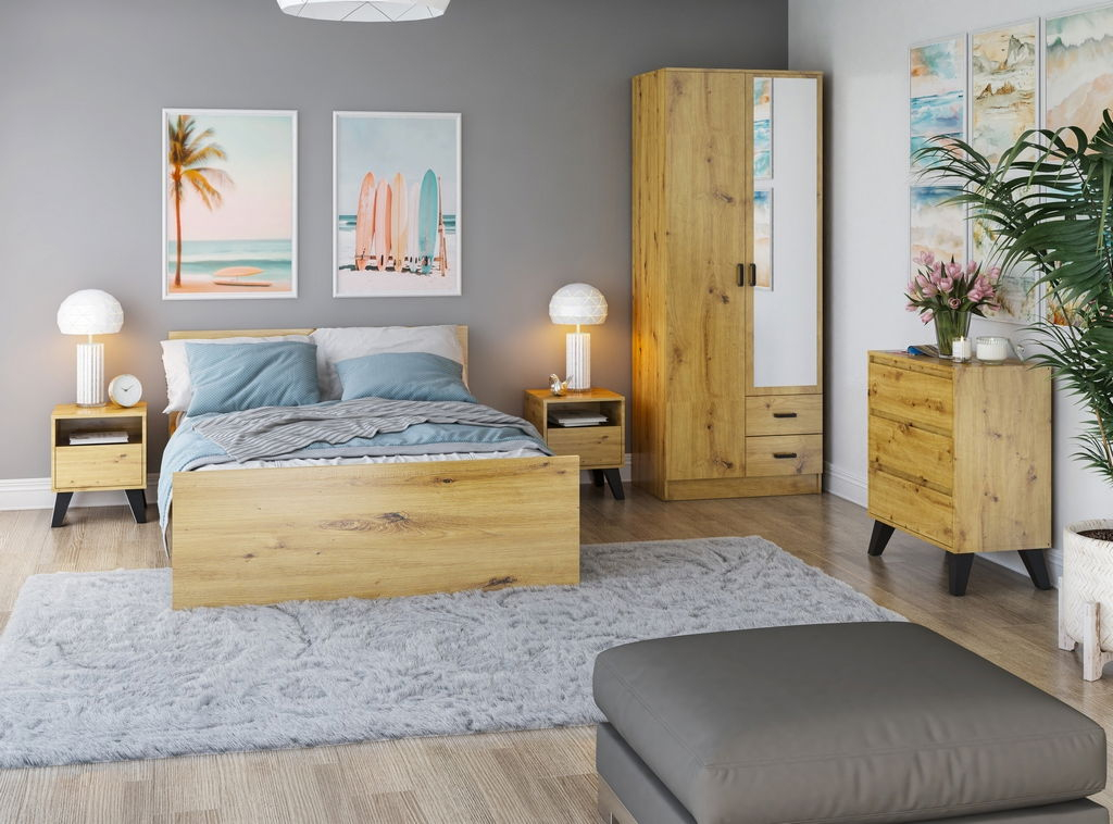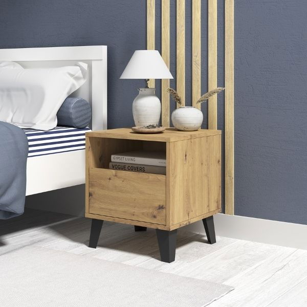 Noptiera BORG în decor stejar artisan, cu sertar și raft, este un accesoriu funcțional și elegant pentru orice dormitor. Designul său compact și elementele practice o fac locul ideal pentru a păstra lucrurile de care ai nevoie lângă pat.