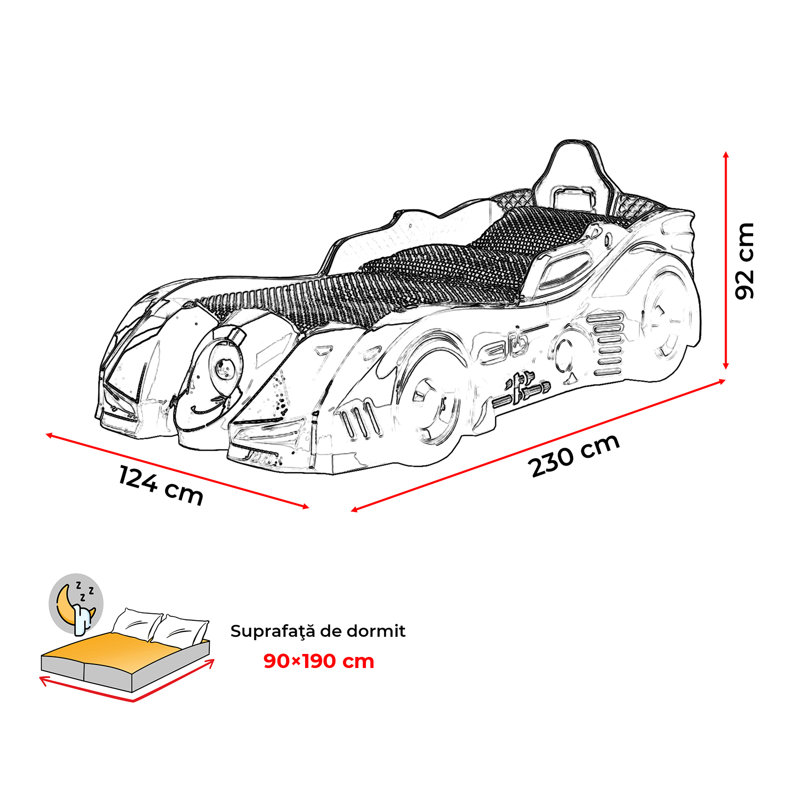 Somnul este un element important in dezvoltarea sanatoasa a copilului tau si, pentru a-l asigura de cele mai bune conditii de odihna, alegerea unui pat de inalta calitate este esentiala. Descopera acum patul nostru pentru copii, masina BATMAN. Patul imbina confortul, siguranta si durabilitatea pentru a oferi micutului tau un somn linistit si fericit in fiecare noapte. Acest pat este construit cu grija, din materiale de cea mai inalta calitate, pentru a oferi un suport solid si sigur pentru micutul tau. Cu un design ergonomic si o atentie deosebita la detalii, acesta este alegerea perfecta pentru a crea un mediu optim pentru odihna si relaxare. Acest pat este alegerea perfecta pentru parintii preocupati de siguranta si confortul copiilor lor.