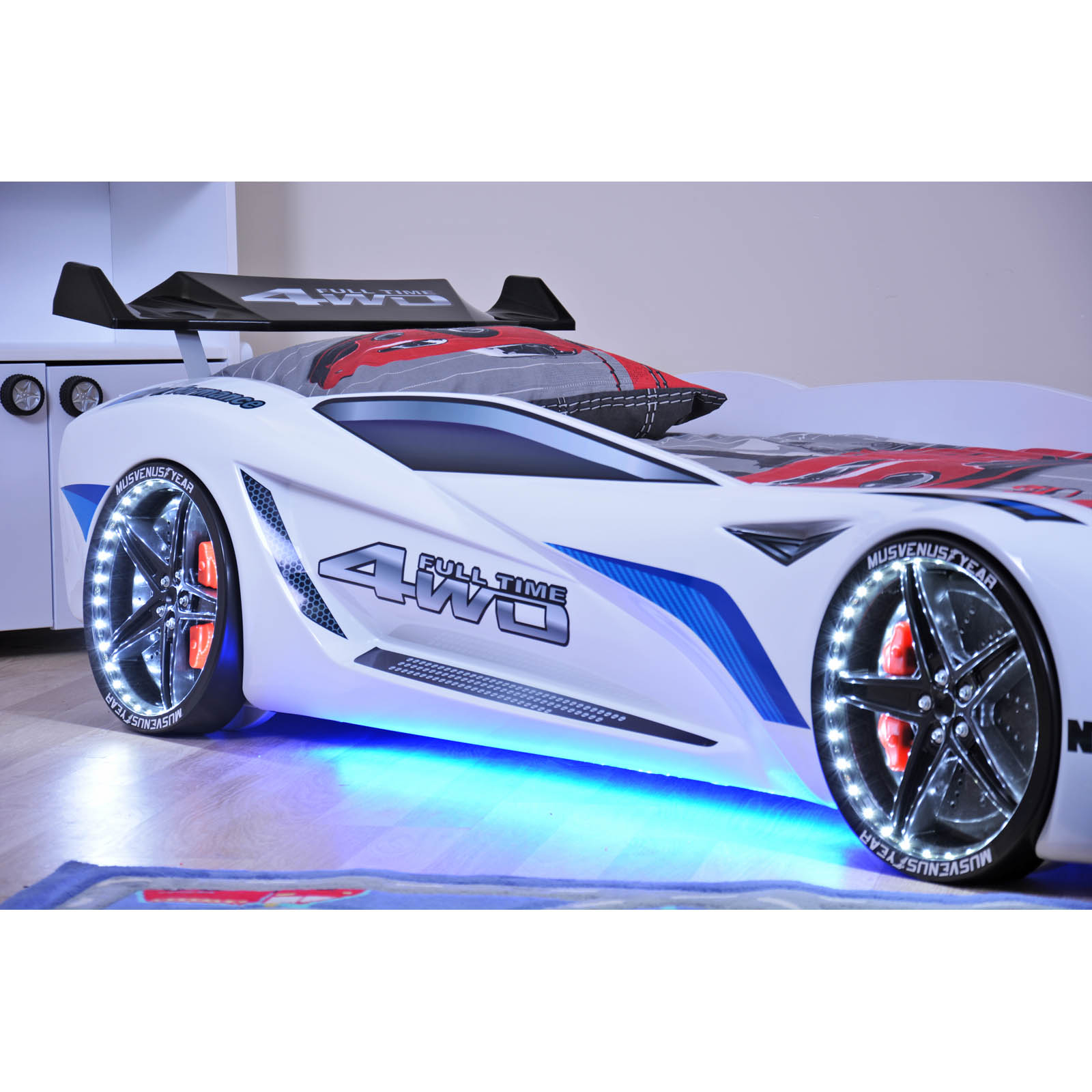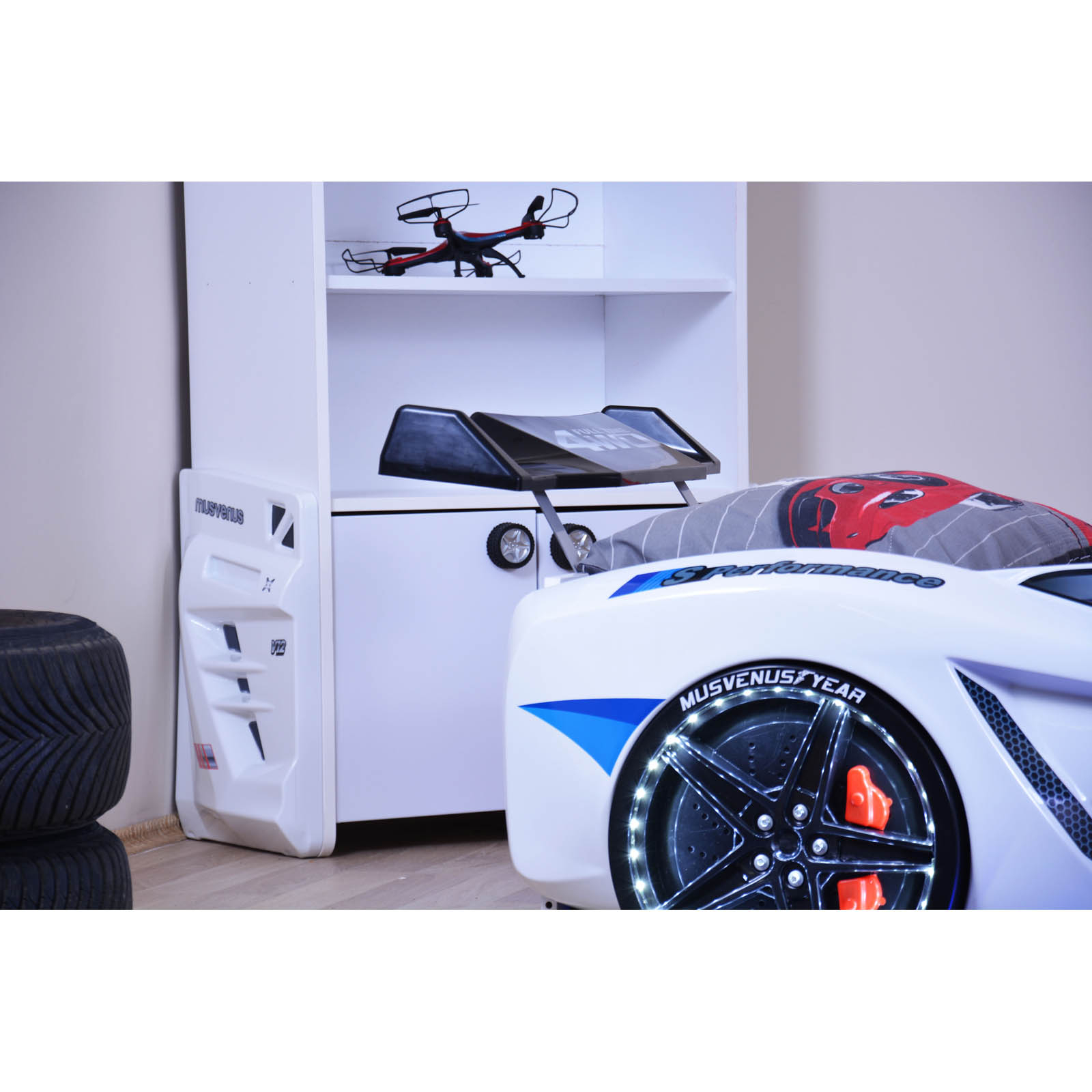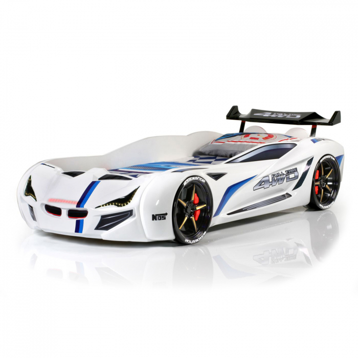 Pat pentru copii masina MVN1, cu sunet, telecomanda si lumini LED, alb, 90x190 cm