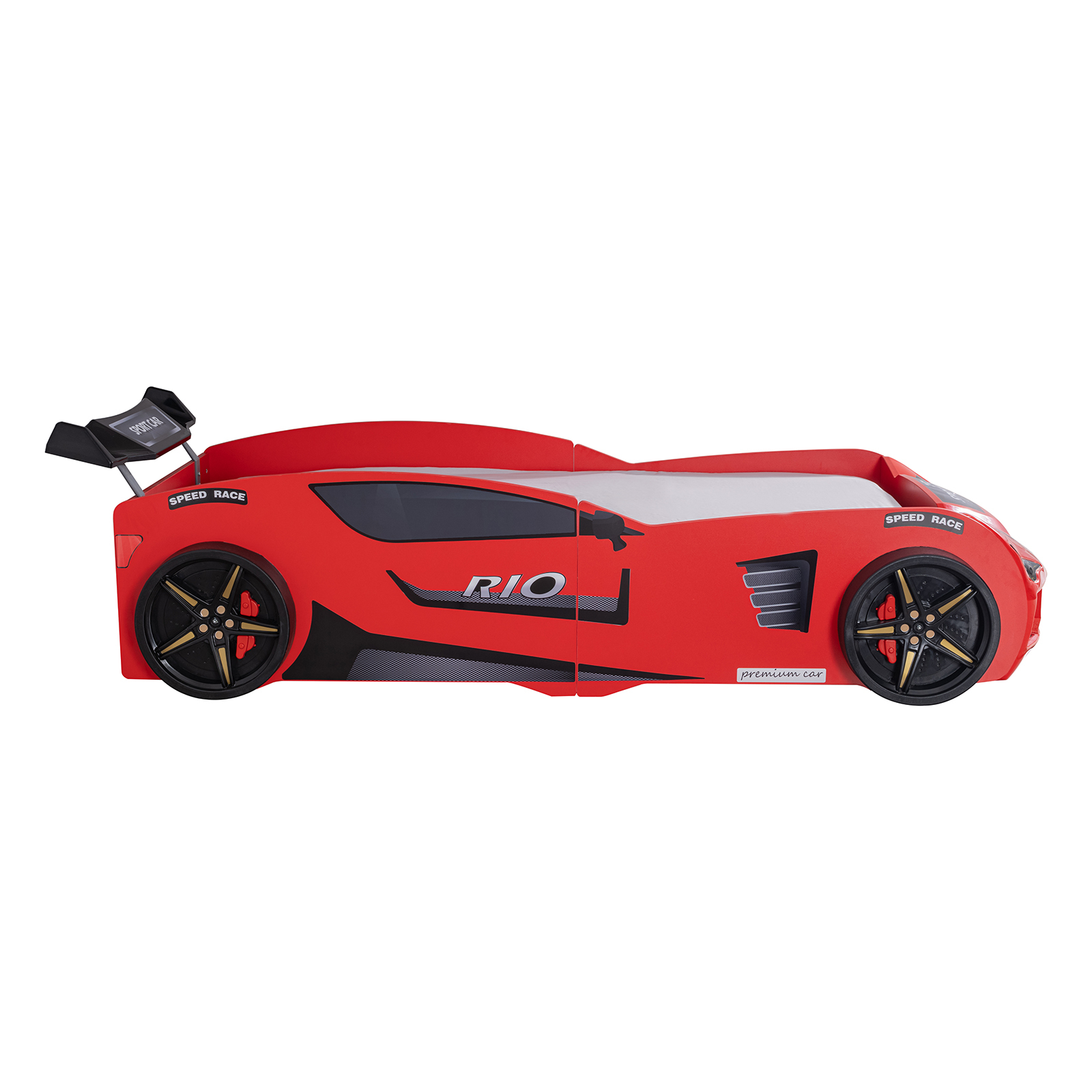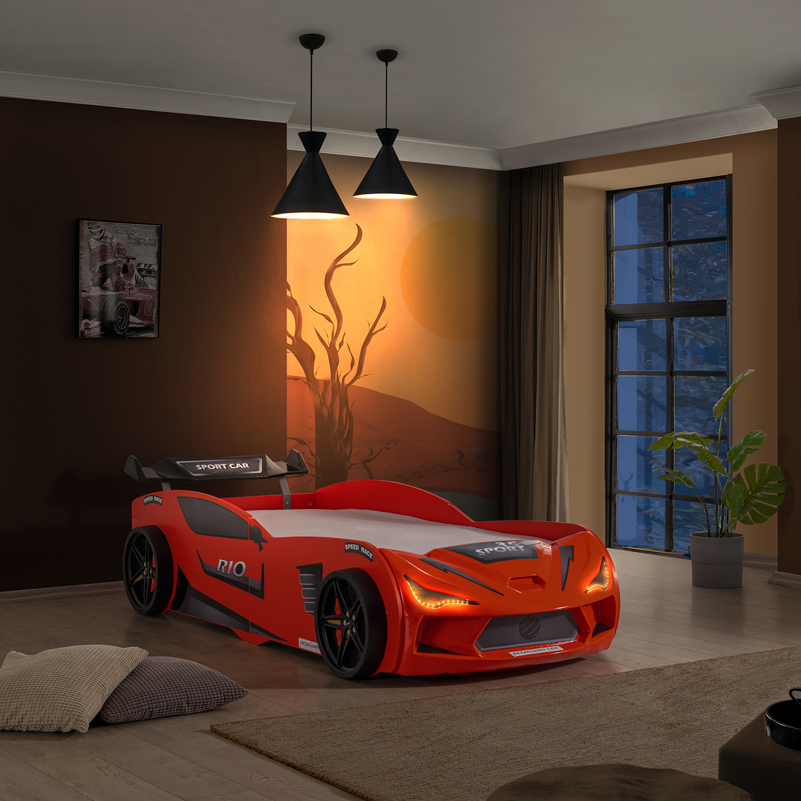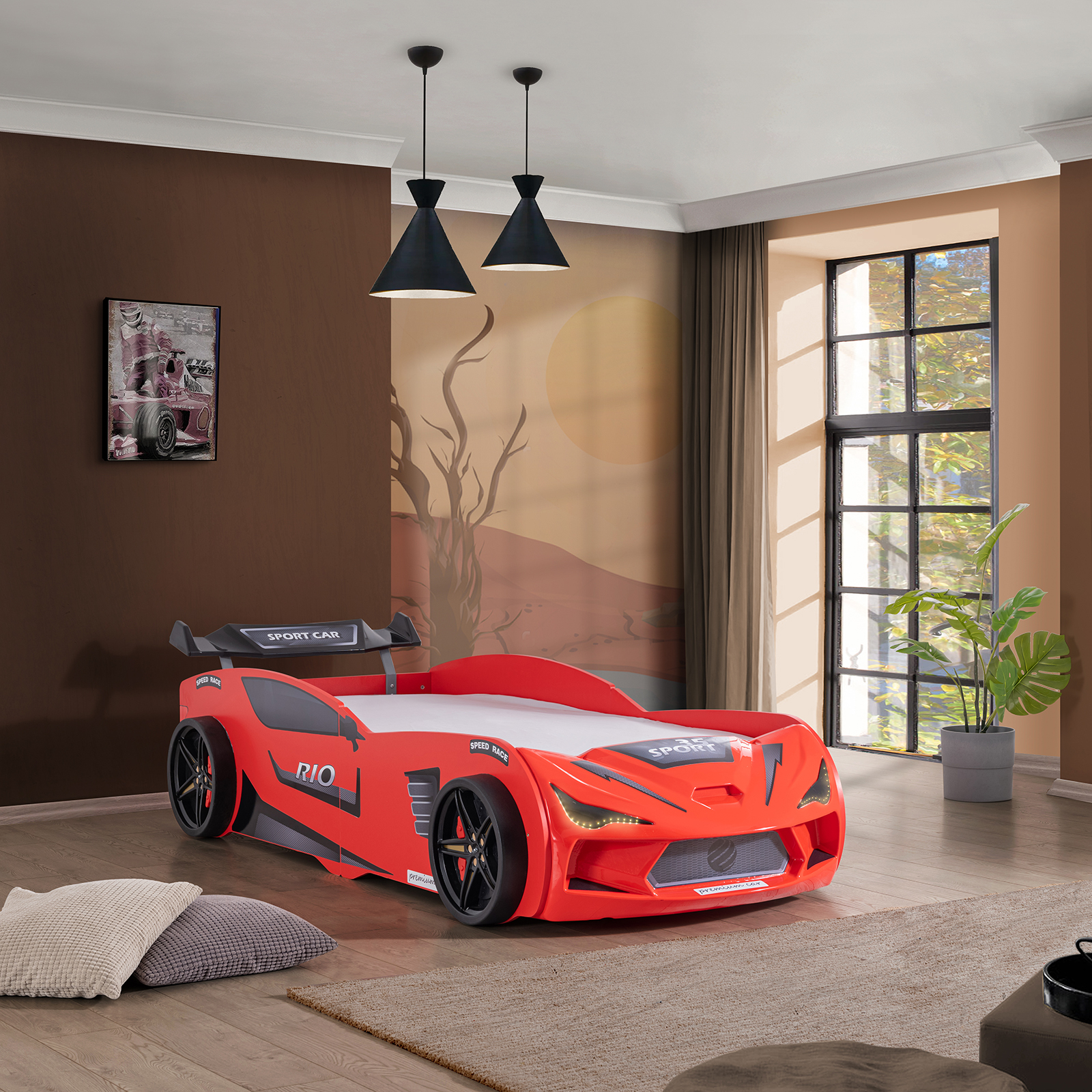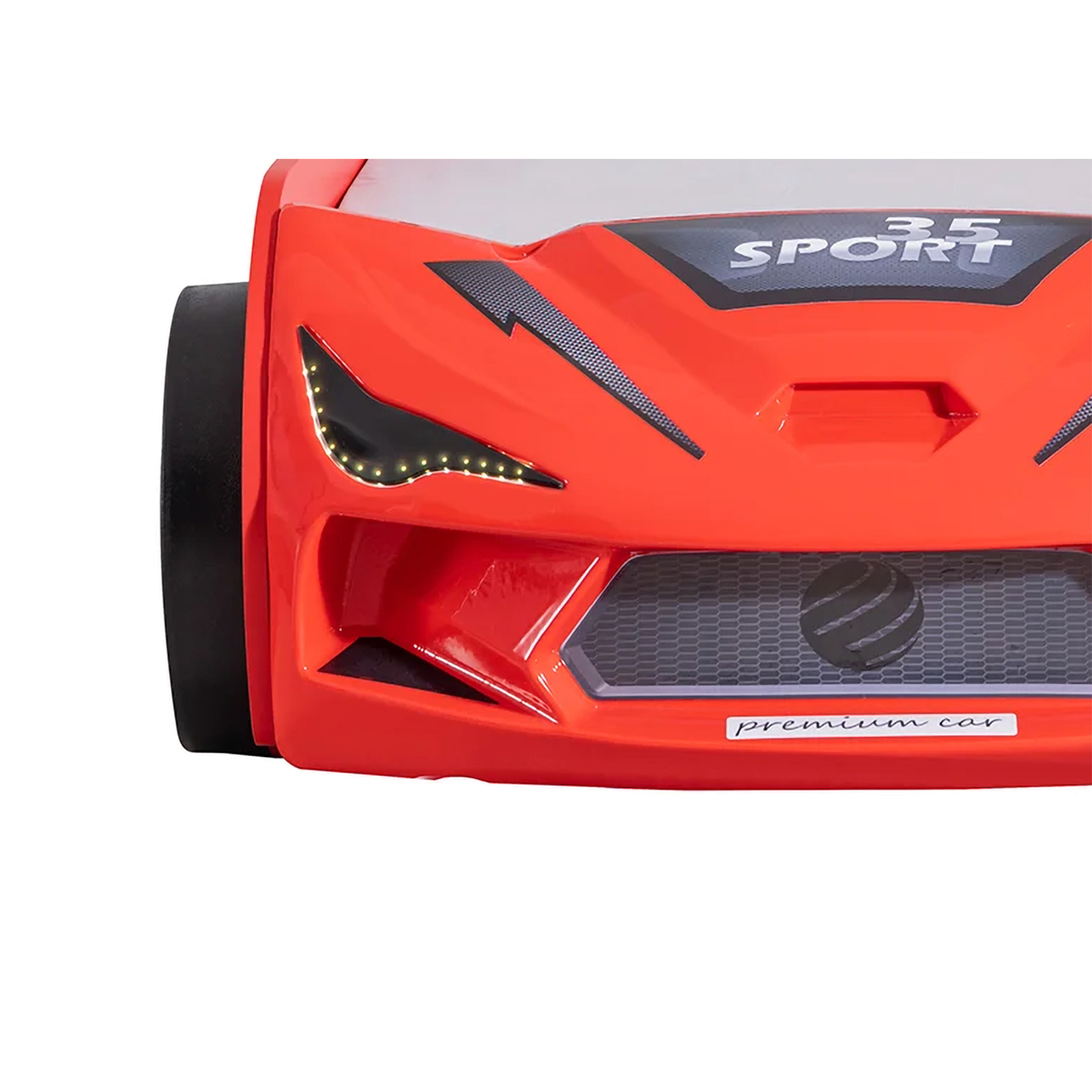Pat pentru copii masina MVN2 ECO, cu faruri, rosu, 90x200 cm