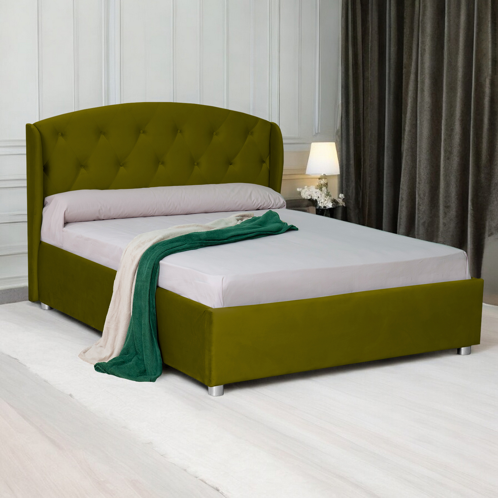 Pat tapitat ROUND, cu somiera rabatabila, spatiu depozitare, verde deschis, 140x200 cm