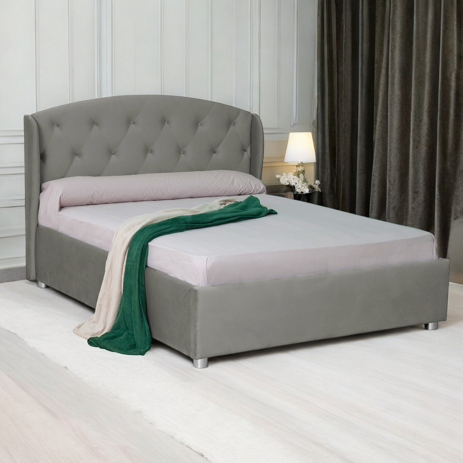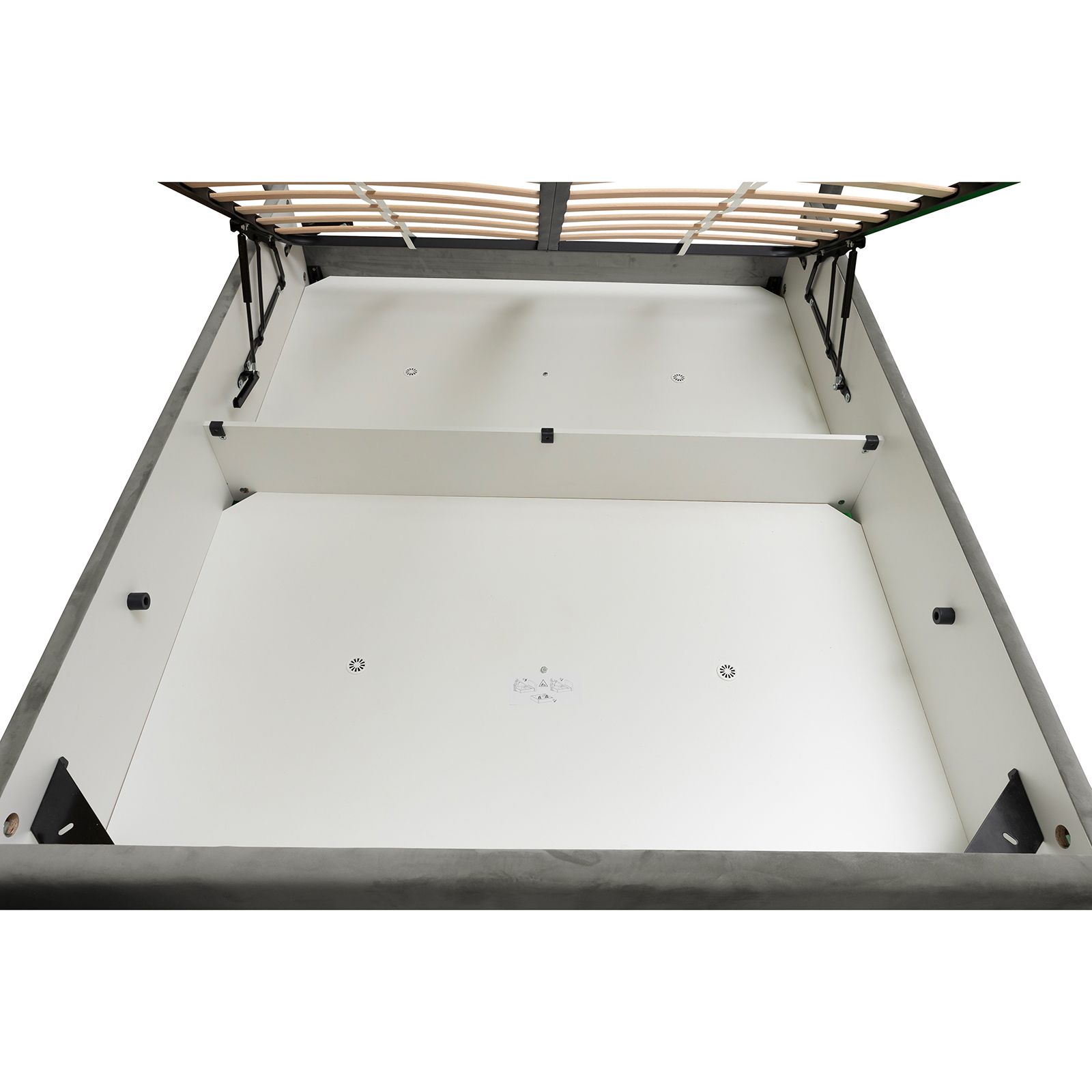Pat tapitat ROUND, cu somiera rabatabila, spatiu depozitare, crem inchis, 160x200 cm