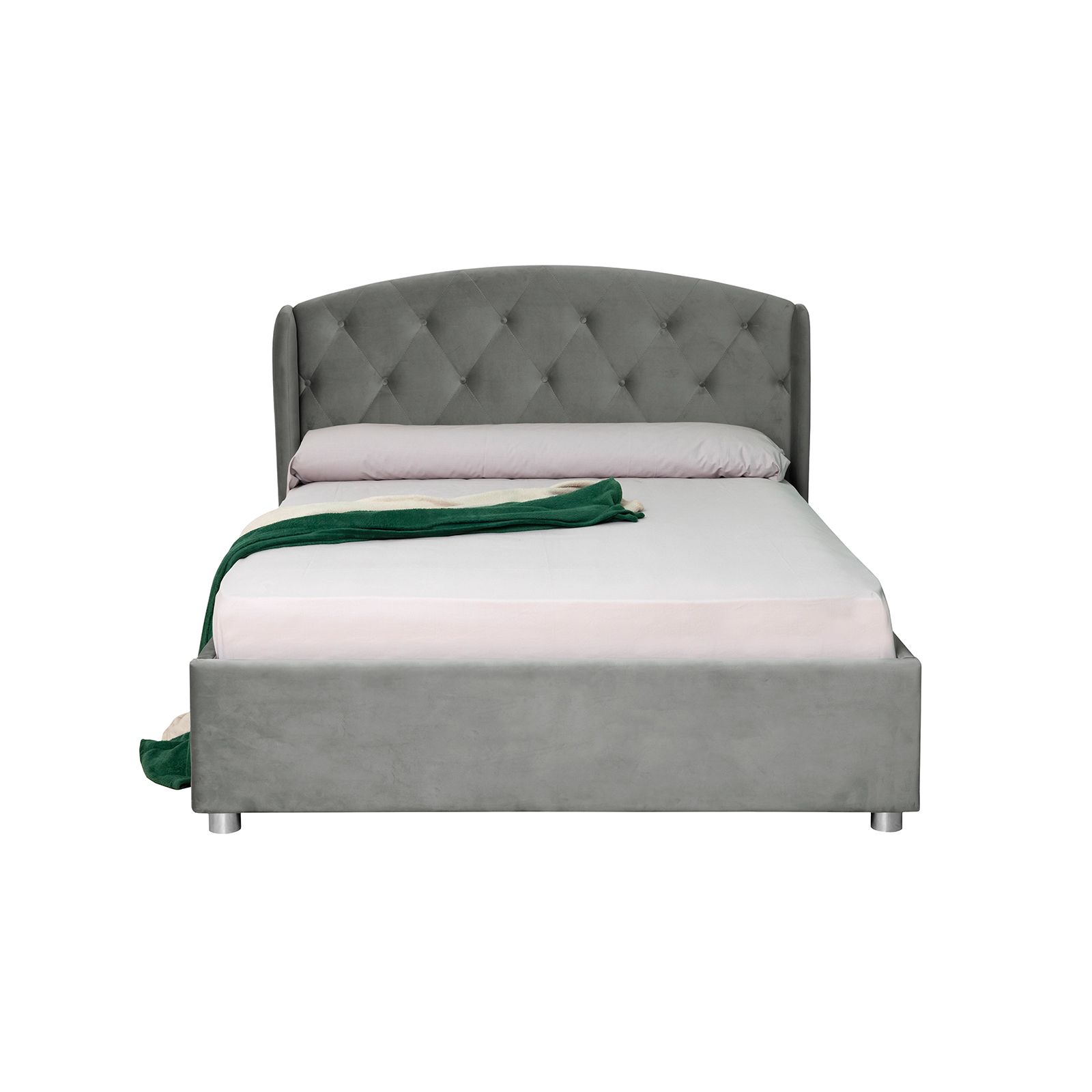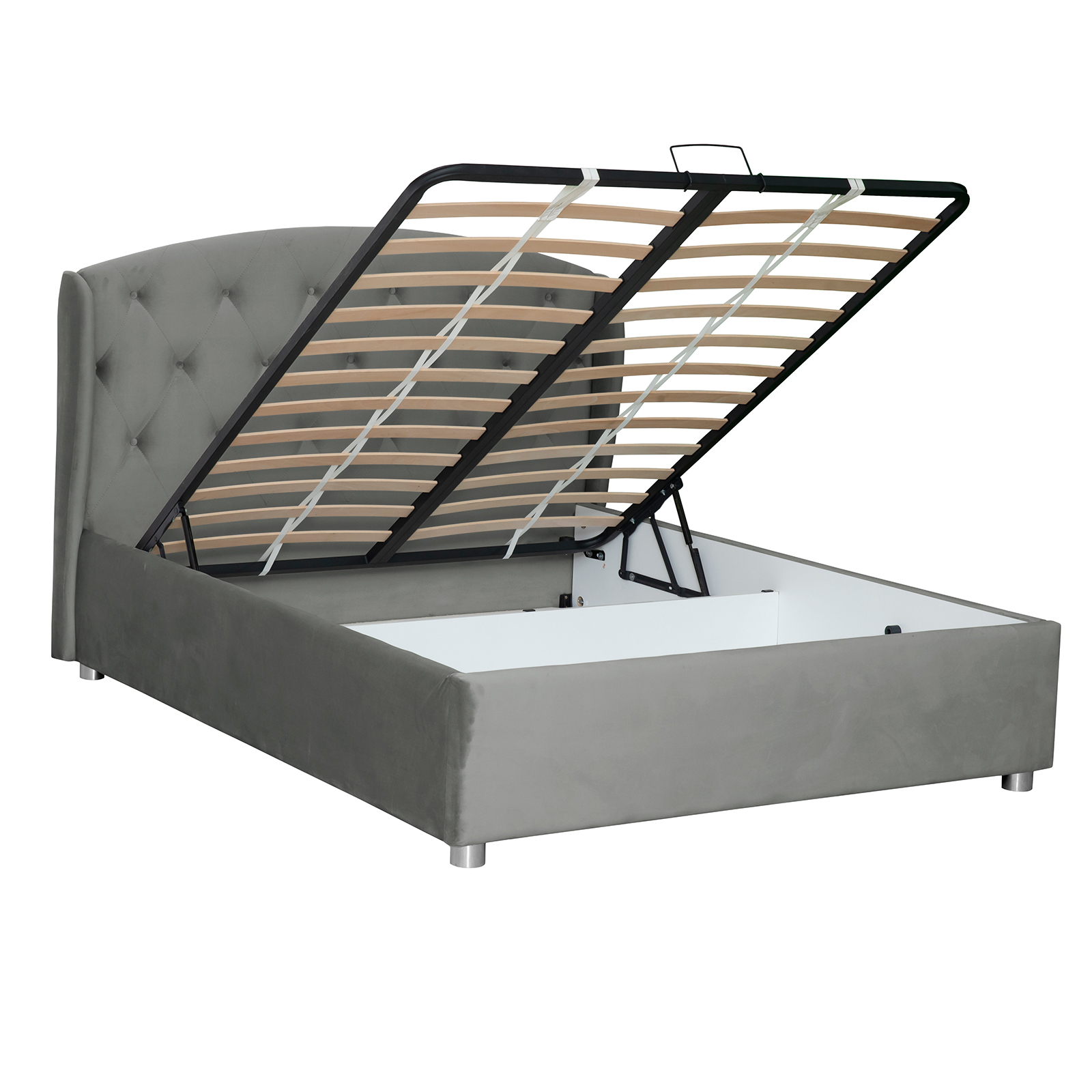 Pat tapitat ROUND, cu somiera rabatabila, spatiu depozitare, gri deschis, 180x200 cm