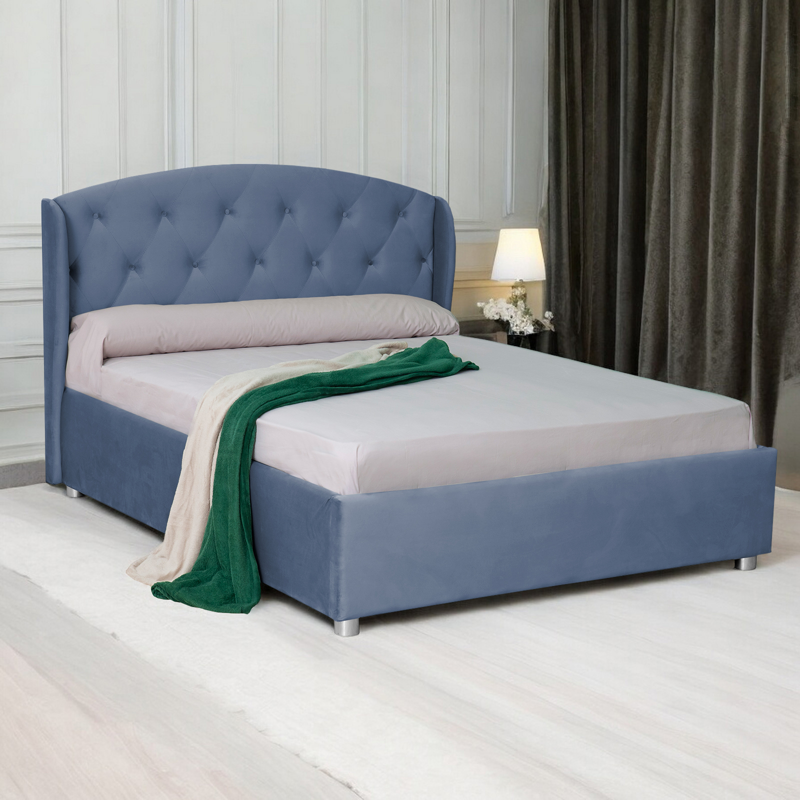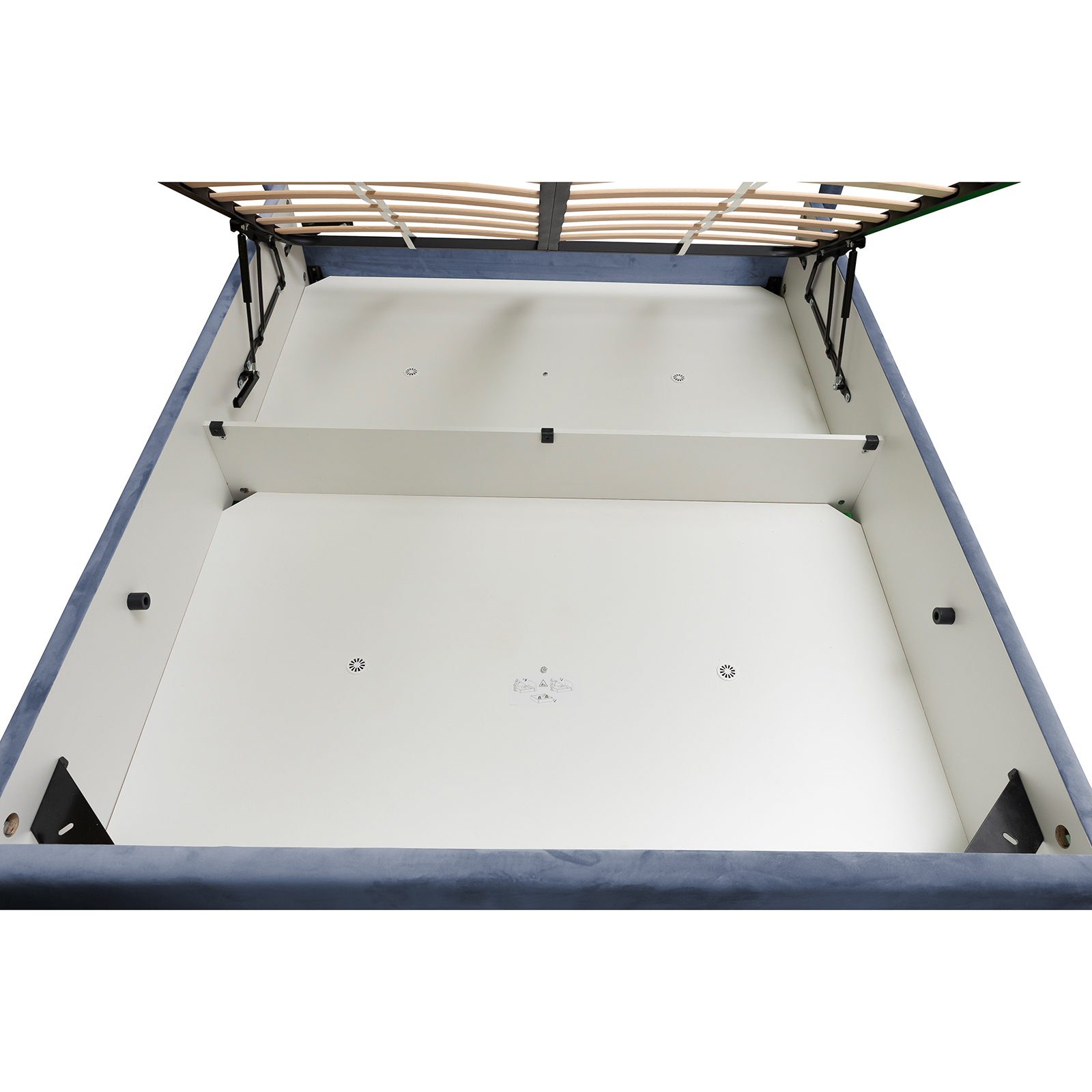 Pat tapitat ROUND, cu somiera rabatabila, spatiu depozitare, albastru, 180x200 cm