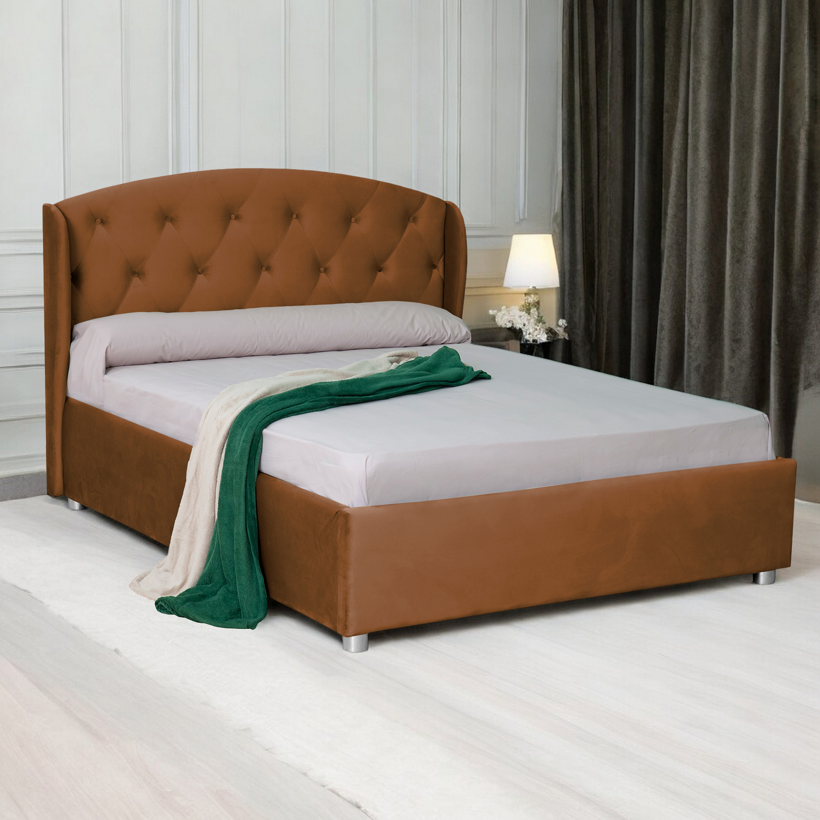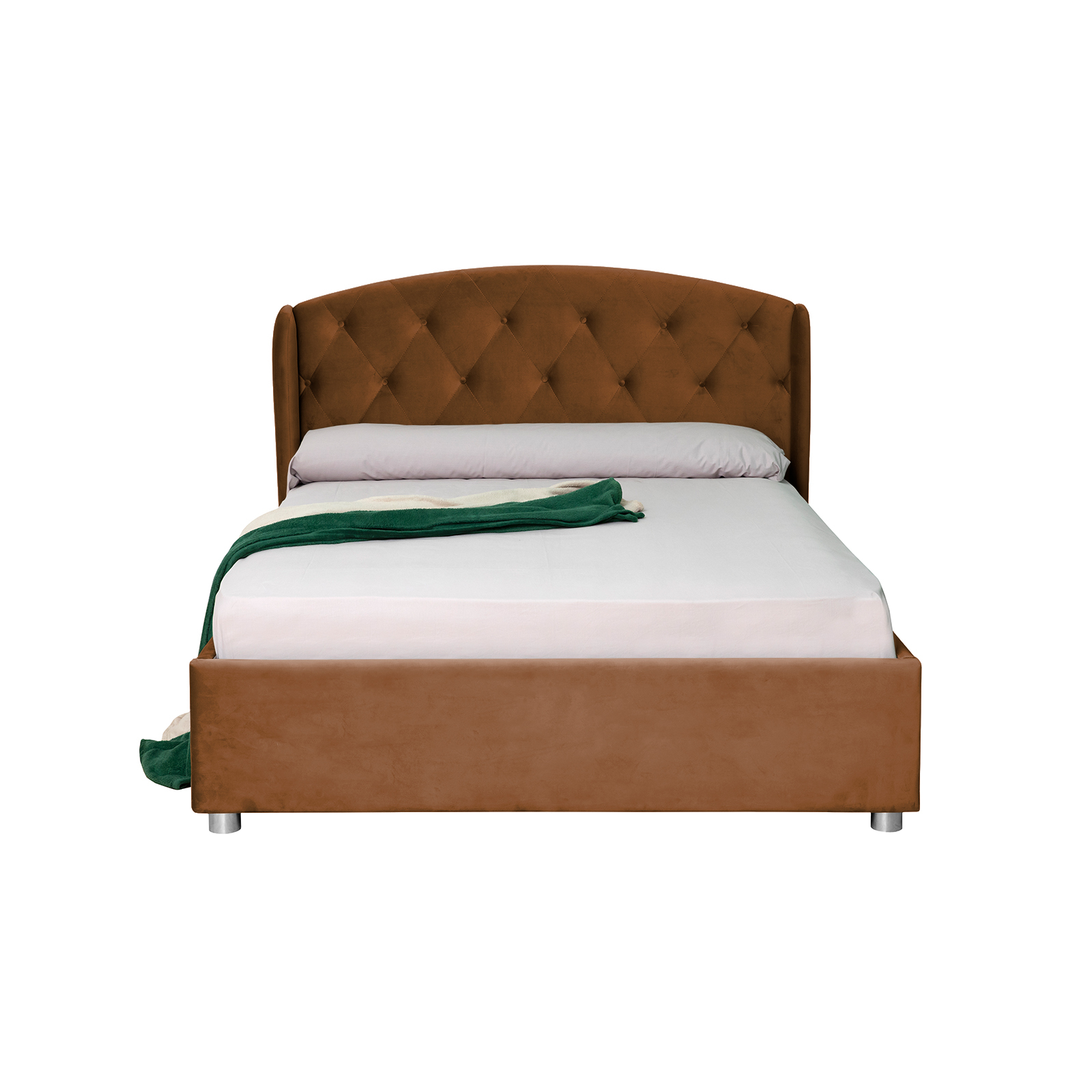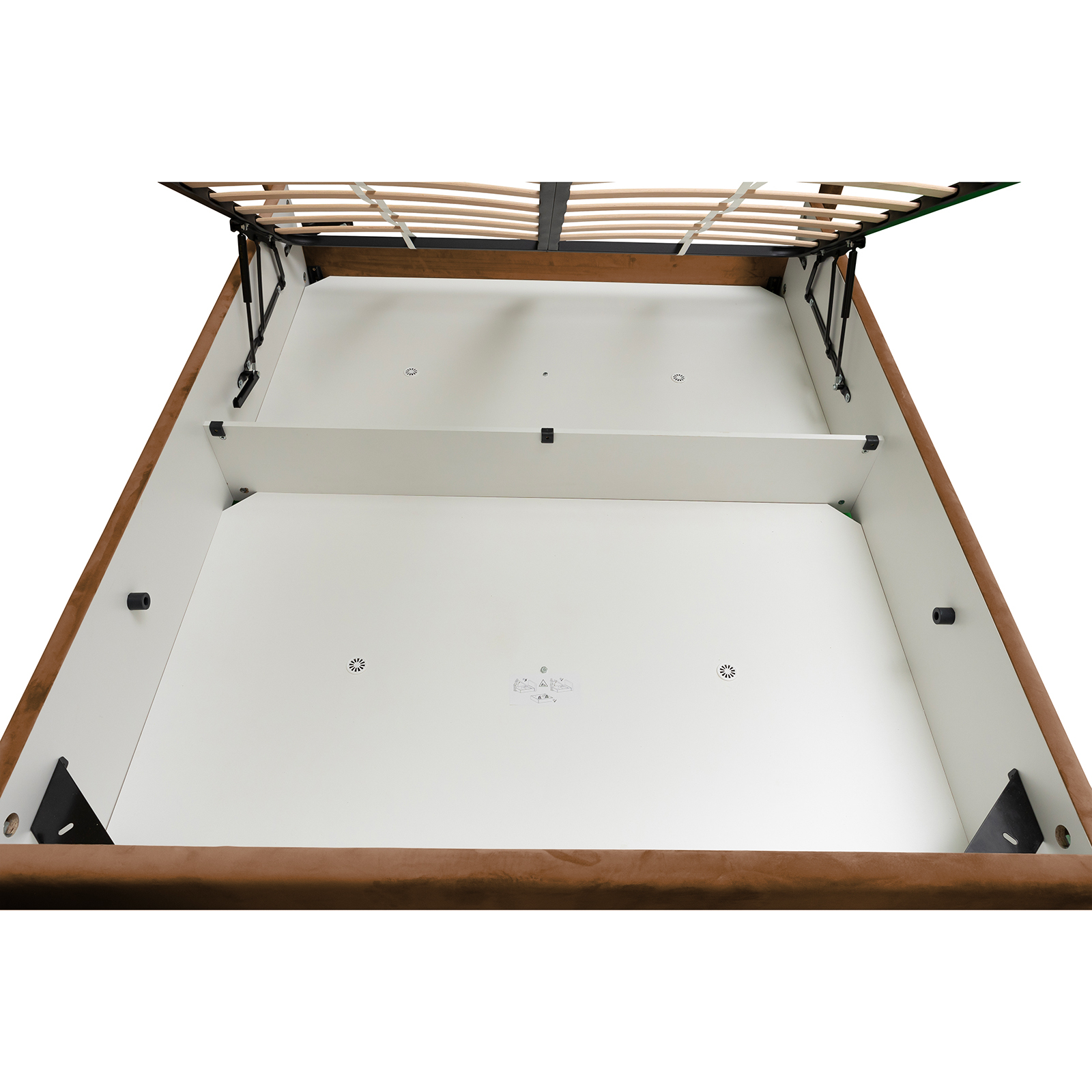 Pat tapitat ROUND, cu somiera rabatabila, spatiu depozitare, caramiziu, 180x200 cm