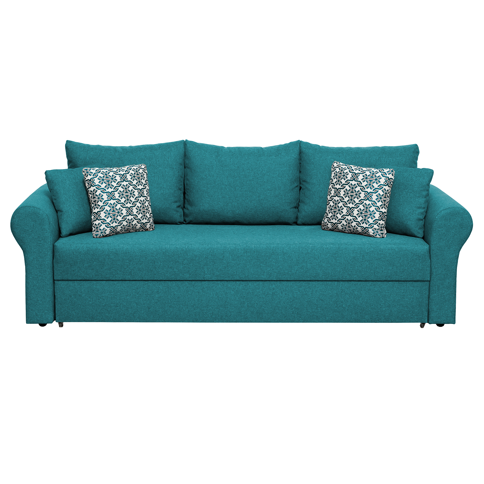 Canapea SARA II extensibila, 3 locuri, cu lada depozitare, turcoaz + print MZT bleu, 235x90x75 cm