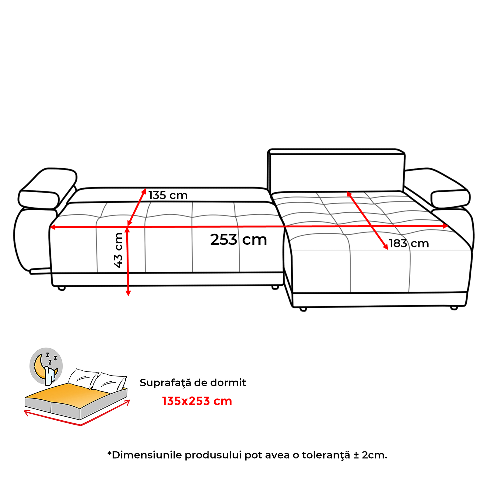 Suprafata dormit: 135x253 cm