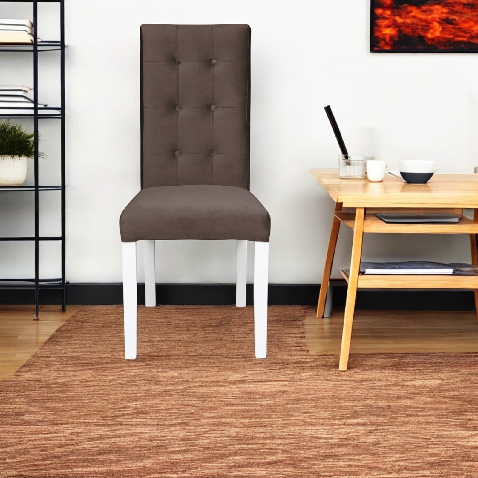 Scaun living TEO LUX, picioare lemn alb, stofa maro, 46x60x98 cm