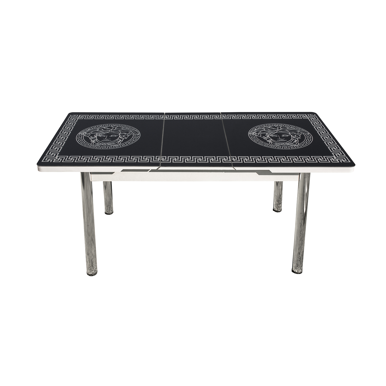 Setul este alcatuit dintr-o masa si 6 scaune, fiind solutia ideala daca doriti sa luati masa, sau sa va relaxati alaturi de cei dragi la servirea ceaiului sau a cafelei. Aceste elemente dispun de o combinatie cromatica armonioasa si eleganta, care va crea un ambient primitor in bucatarie sau living, adaugand un plus de modernitate. Masa este extensibila si prevazuta cu picioare din metal cromat, blat din PAL si sticla. Cele 6 scaune sunt construite cu picioare din metal cromat, fiind tapitate cu imitatie de piele. Sezutul este rotund si spatarul curbat pentru a conferi unicitate.