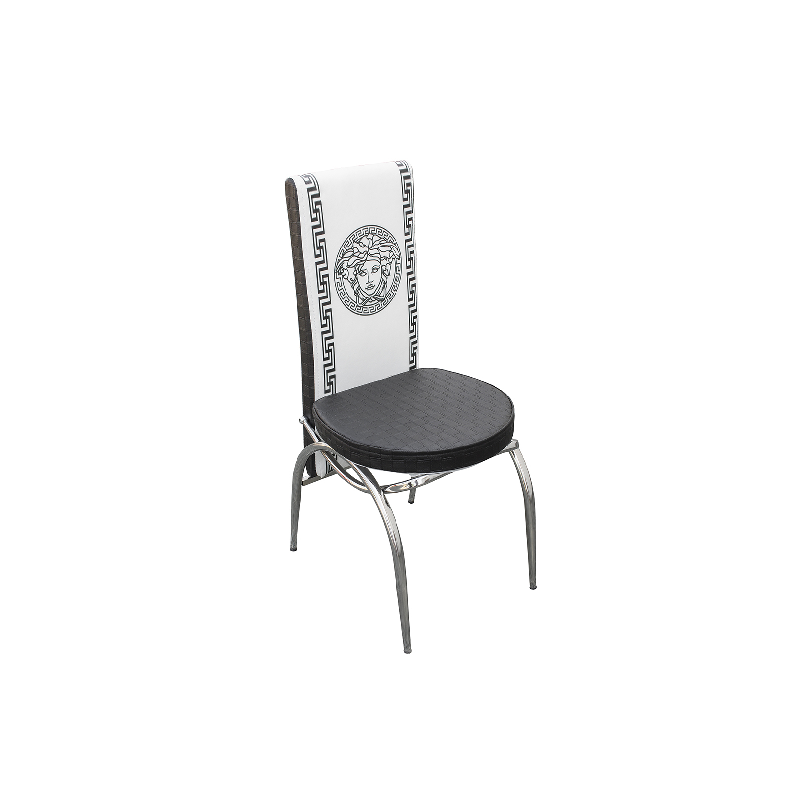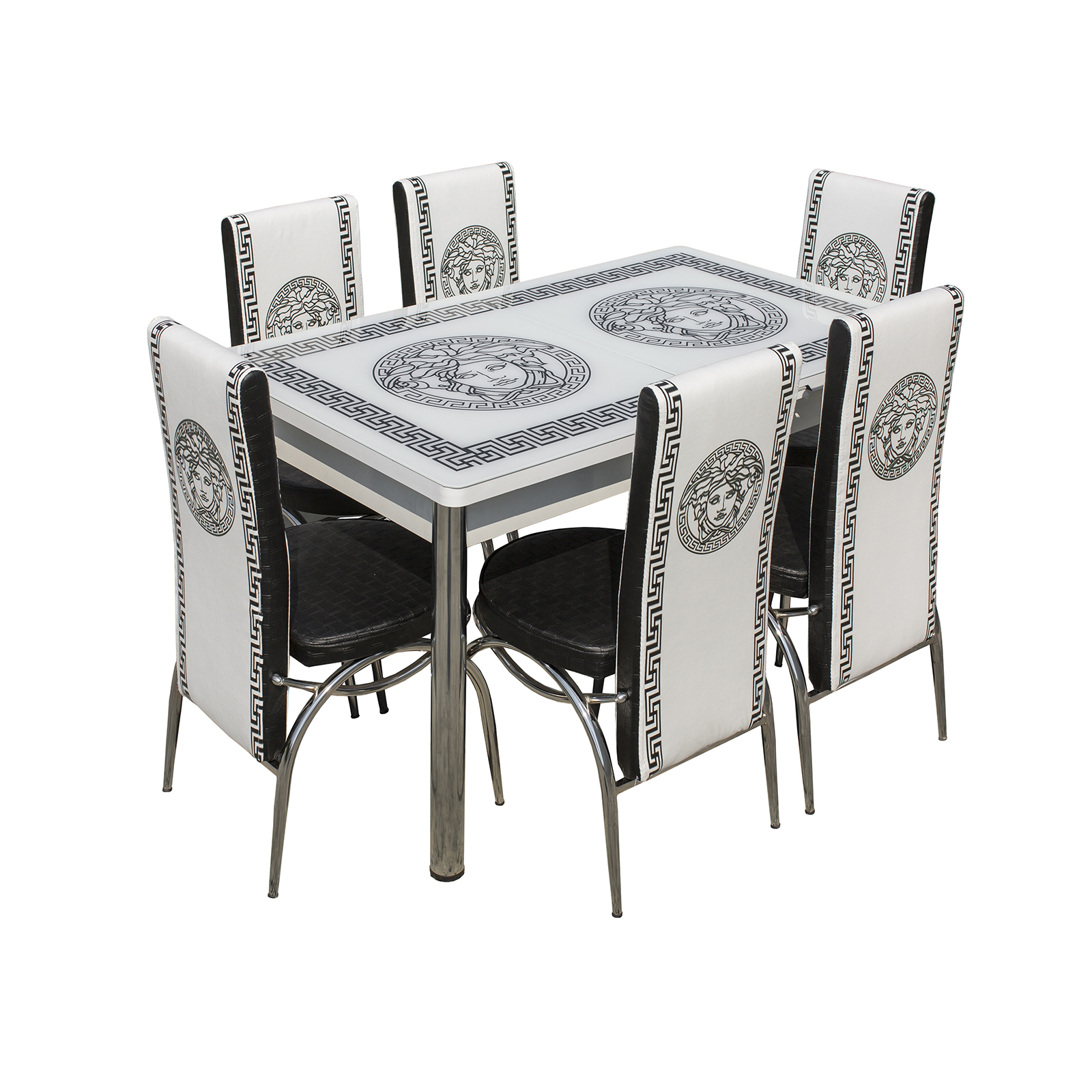 Setul este alcatuit dintr-o masa si 6 scaune, fiind solutia ideala daca doriti sa luati masa, sau sa va relaxati alaturi de cei dragi la servirea ceaiului sau a cafelei. Aceste elemente dispun de o combinatie cromatica armonioasa si eleganta, care va crea un ambient primitor in bucatarie sau living, adaugand un plus de modernitate. Masa este extensibila si prevazuta cu picioare din metal cromat, blat din PAL si sticla. Cele 6 scaune sunt construite cu picioare din metal cromat, fiind tapitate cu imitatie de piele. Sezutul este rotund si spatarul curbat pentru a conferi unicitate.