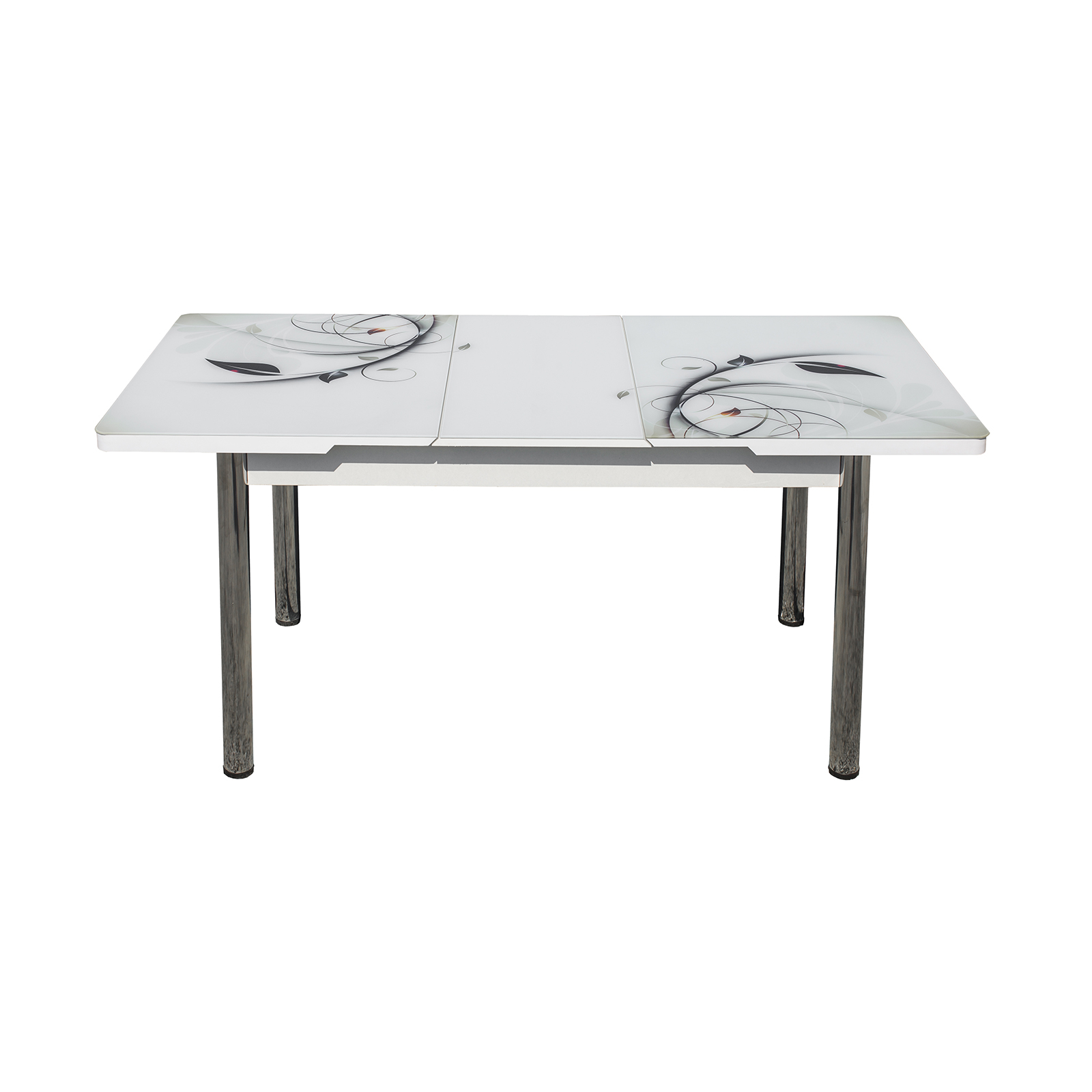 Setul este alcatuit dintr-o masa si 6 scaune, fiind solutia ideala daca doriti sa luati masa, sau sa va relaxati alaturi de cei dragi la servirea ceaiului sau a cafelei. Aceste elemente dispun de o combinatie cromatica armonioasa si eleganta, care va crea un ambient primitor in bucatarie sau living, adaugand un plus de modernitate. Masa este extensibila si prevazuta cu picioare din metal cromat, blat din PAL si sticla. Cele 6 scaune sunt construite cu picioare din metal cromat, fiind tapitate cu imitatie de piele. Sezutul este rotund si spatarul curbat pentru a conferi unicitate.